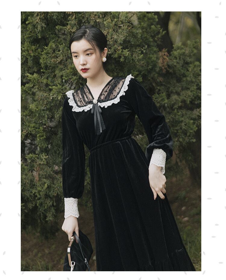 送料無料୨♥୧ オータムウィンターレディースブラックロングドレス カラーメッシュリボンベルベットヴィンテージフリルレース ラッフル 秋物 冬物 ビンテージ AOS80584123775
