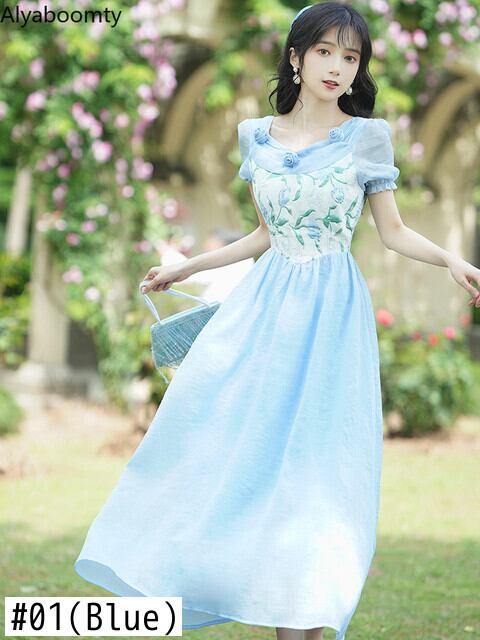 送料無料୨♥୧ サマーレディースドレス カラージャカードパッチワークブルーロングフローラル 夏物 花柄 スクウェア AOS85586111055