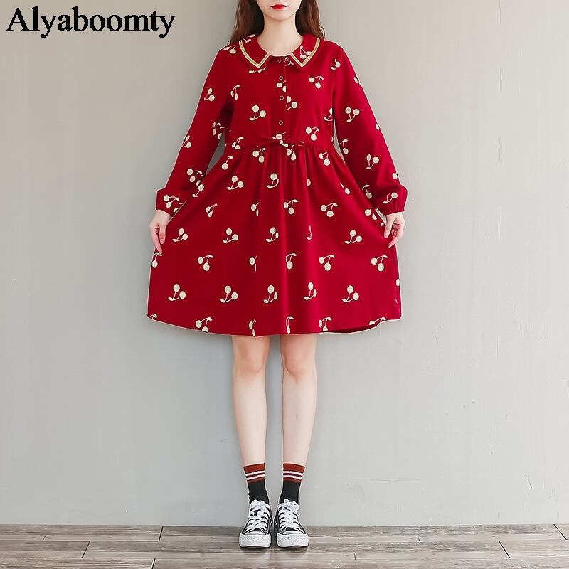 送料無料୨♥୧ オータムスプリングレディースドレス カラープリントレッドダークグレー長袖スリーブ ロング 大人ガーリー スウィート キュート カジュアル 春物 秋物 AOS70618624102