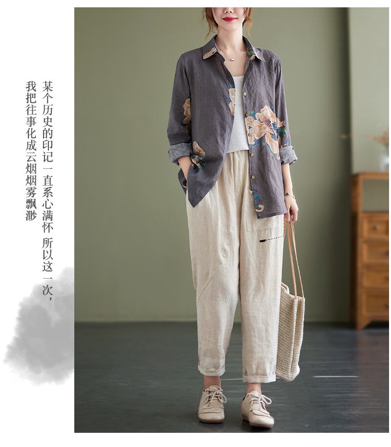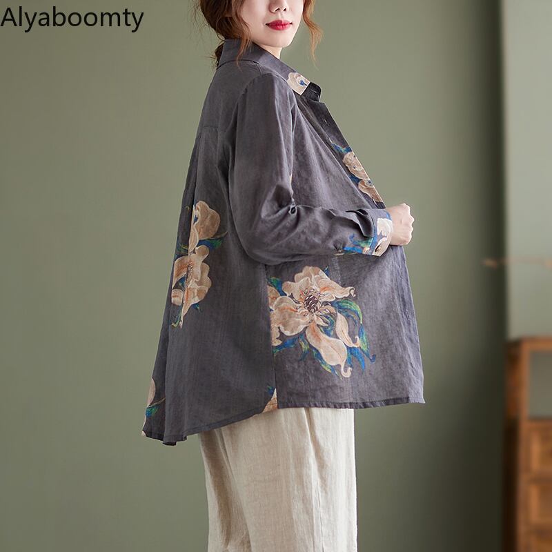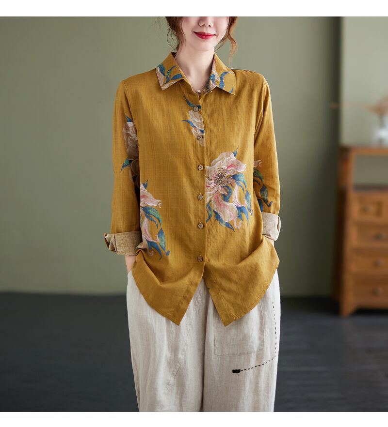 送料無料୨♥୧ スプリングオータムレディースヴィンテージブラウス カラーイエローグレーフローラルプリントルーズ長袖スリーブシャツ ロング コットン 春物 秋物 花柄 ビンテージ AOS65142205711