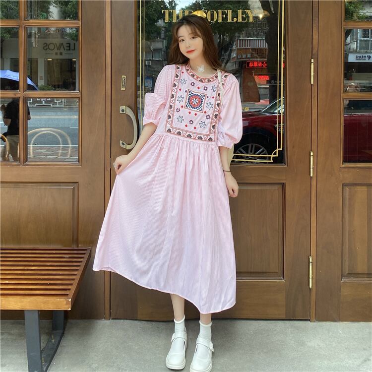 送料無料୨♥୧ サマーレディースロングドレス ブルーストライプルーズフローラル刺繍ヴィンテージ ピンク 大人ガーリー スウィート キュート カジュアル 夏物 花柄 Oネック ビンテージ AOS31026549504
