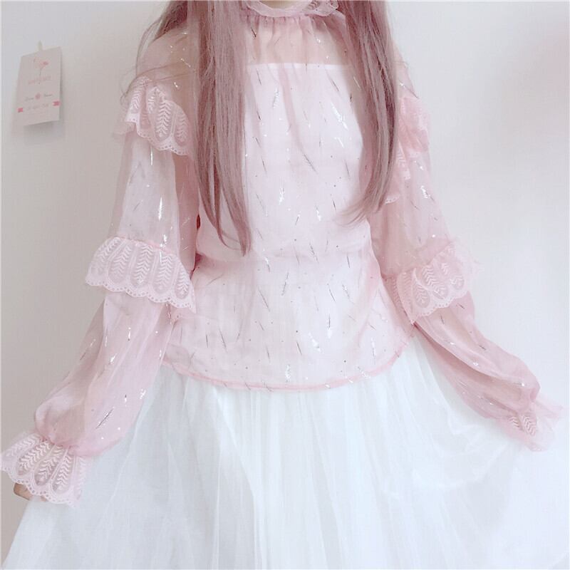 送料無料୨♥୧ スタイルスプリングオータムレディースブラウス ホワイトフリルシフォンシャツ レース ピンク ラッフル 大人ガーリー スウィート キュート カジュアル 春物 秋物 AOS60534440767