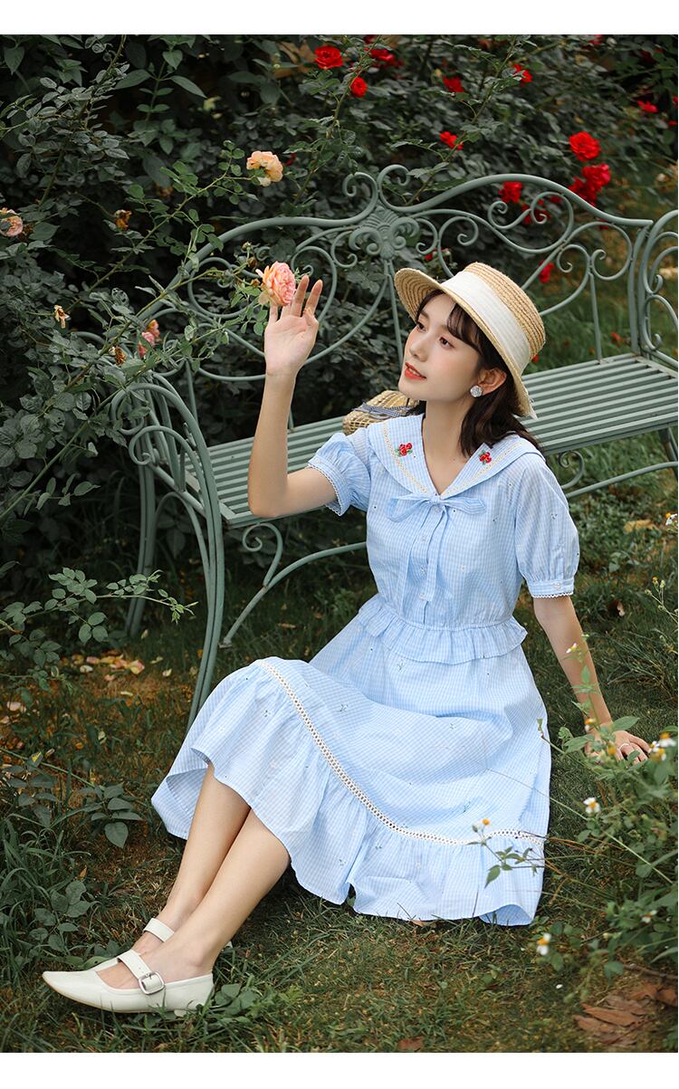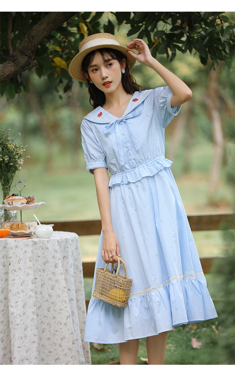 送料無料୨♥୧ サマーレディースブルーミディドレス カラー格子柄フリル ラッフル 大人ガーリー スウィート キュート カジュアル 夏物 AOS49103026400