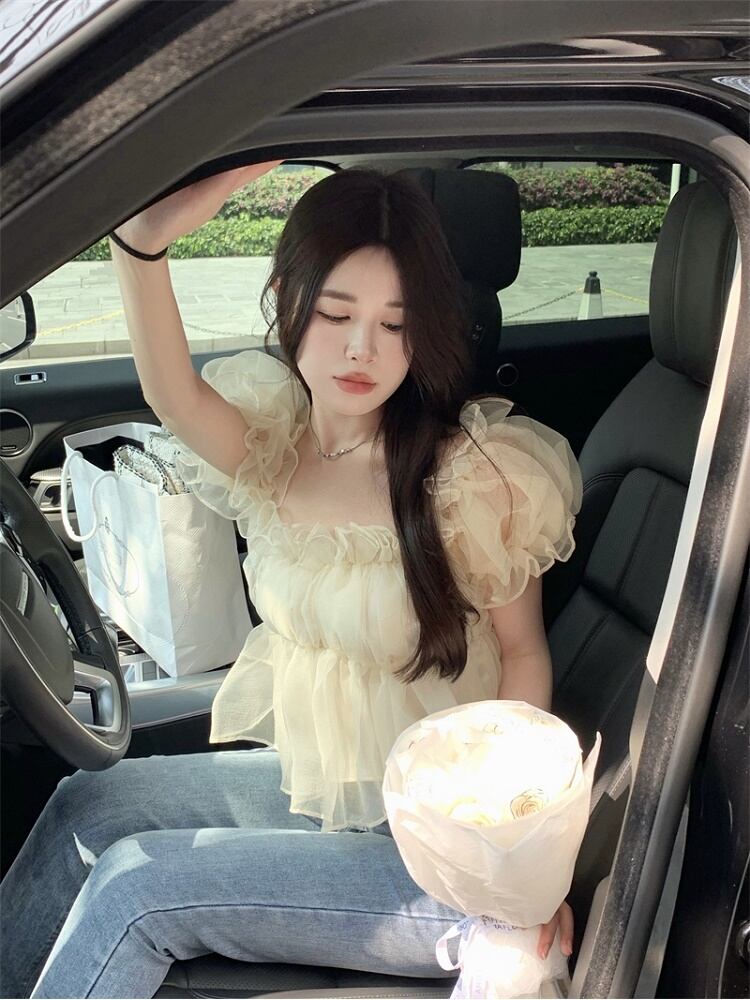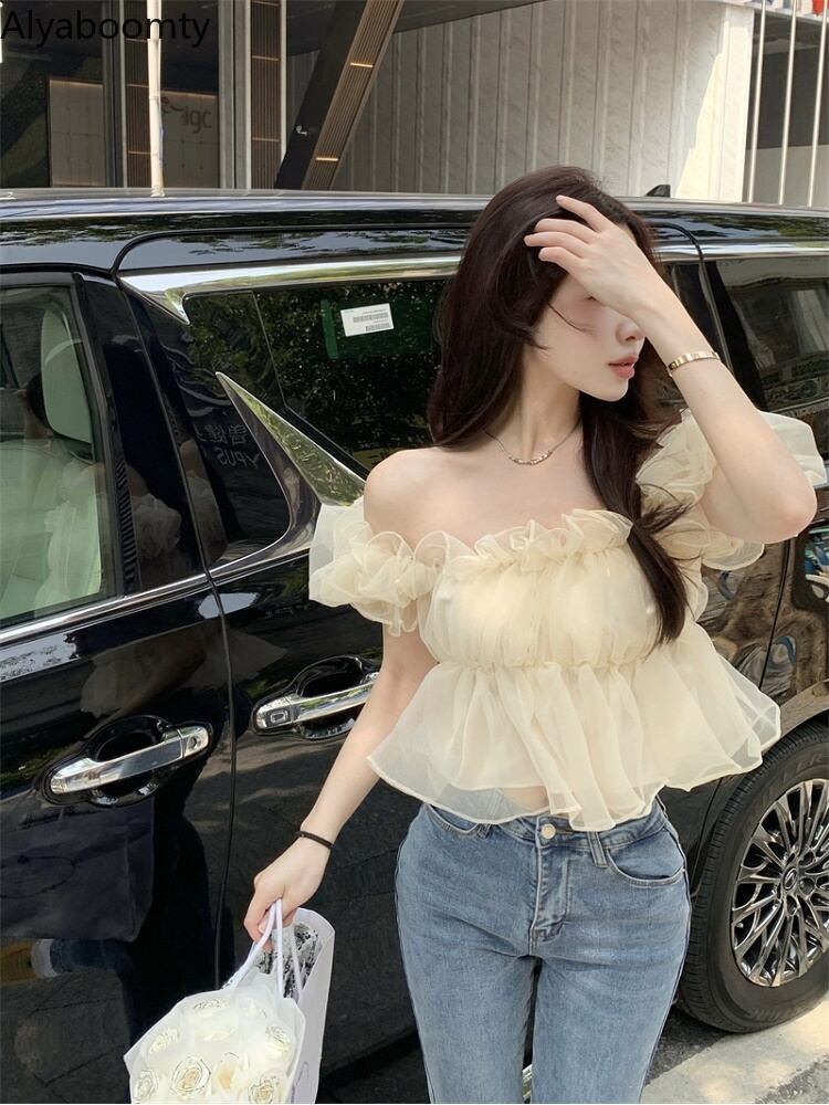 送料無料୨♥୧ サマーレディースショートブラウス フリルスリーブメッシュクロップトップ トップス ラッフル 大人ガーリー スウィート キュート カジュアル 夏物 AOS23826898809