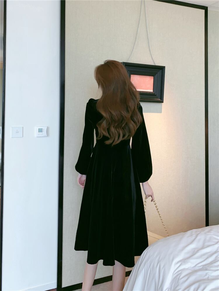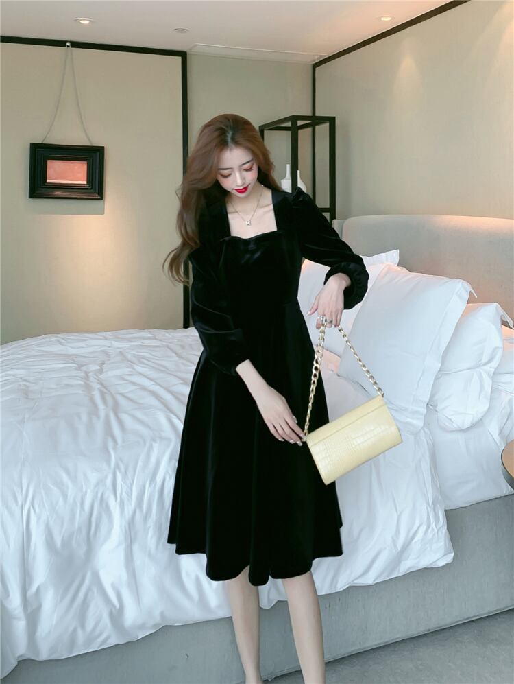 送料無料୨♥୧ スプリングオータムレディースブラックAラインドレス カラーソリッド ベルベットロングスリーブヴィンテージミディ ランタンスリーブ 春物 秋物 ソリッドカラー スクウェア ビンテージ 会社 学校 通勤や通学にも AOS28350998774