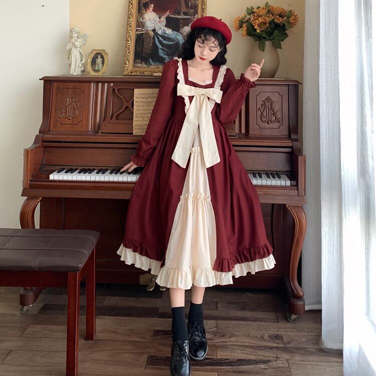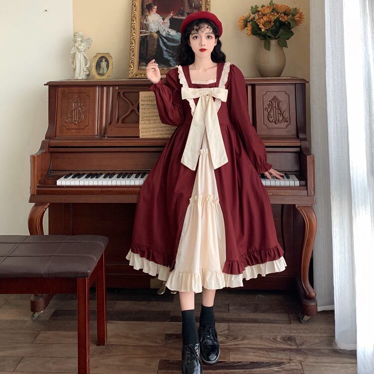 送料無料୨♥୧ スタイルレディースミディドレス カラーパッチワークリボンフリルルーズ ラッフル 大人ガーリー スウィート キュート カジュアル スクウェア AOS37047421885