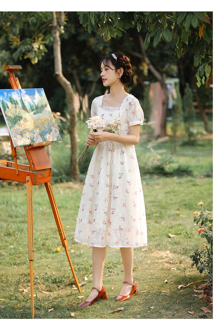 送料無料୨♥୧ サマーレディースミディドレス カラーフローラルプリント半袖スリーブAライン ショート ハーフスリーブ 大人ガーリー スウィート キュート カジュアル 夏物 花柄 スクウェア AOS25591445908
