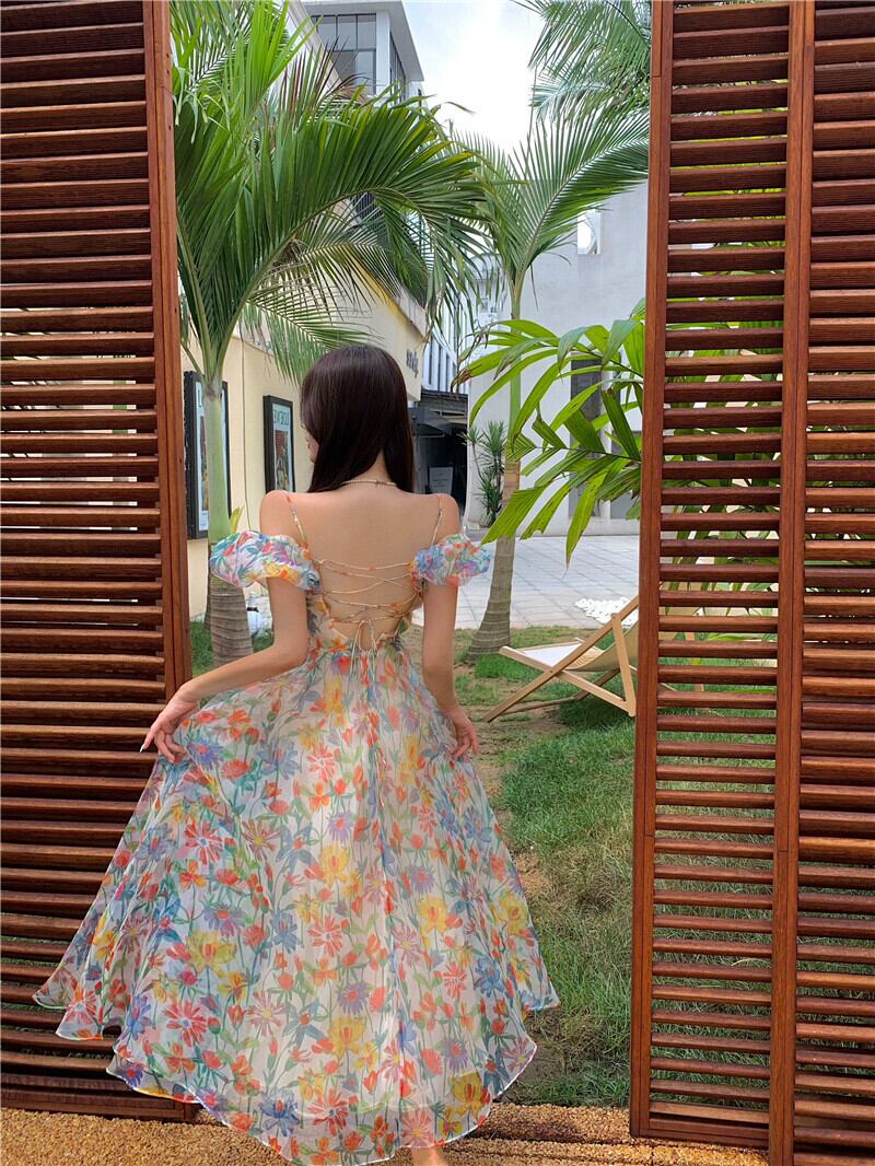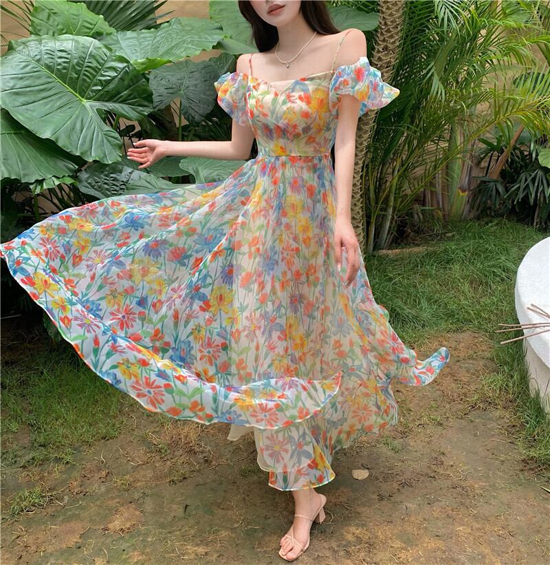 送料無料୨♥୧ サマーレディースフローラルロングドレス プリントスリーブバンドドレス ワンピース 夏物 ビーチ 花柄 フラワーデザイン AOS68712402912