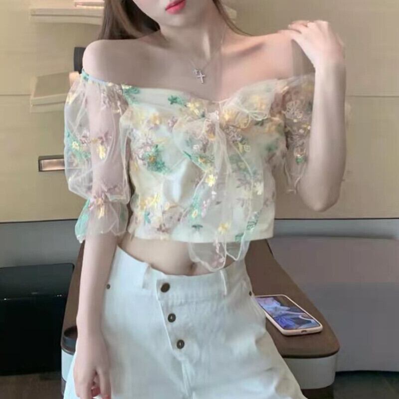 送料無料୨♥୧ サマーレディースクロップトップ トップス フローラル刺繍メッシュブラウス スリーブバンドシャツ 夏物 花柄 AOS48022646600
