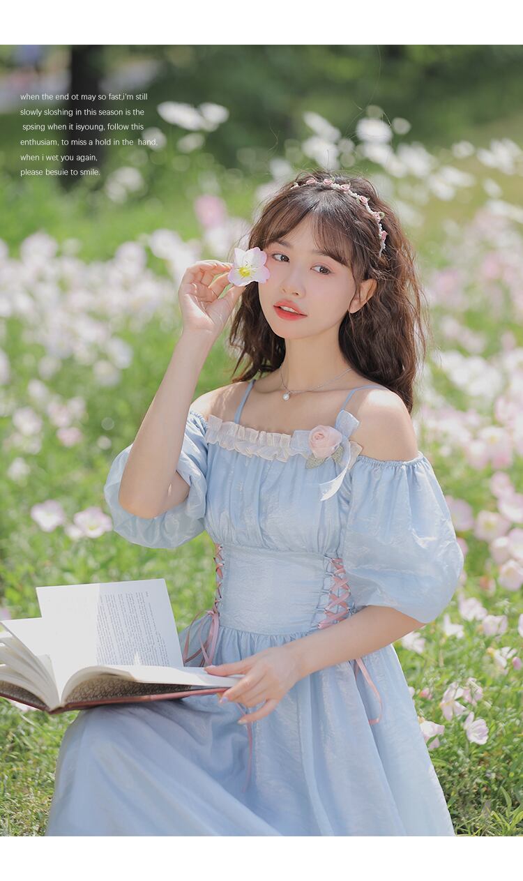 送料無料୨♥୧ サマーレディースミディドレス ブルーバンドFlowerデザイン オフショルダー 大人ガーリー スウィート キュート カジュアル 夏物 フラワーデザイン AOS18045978069