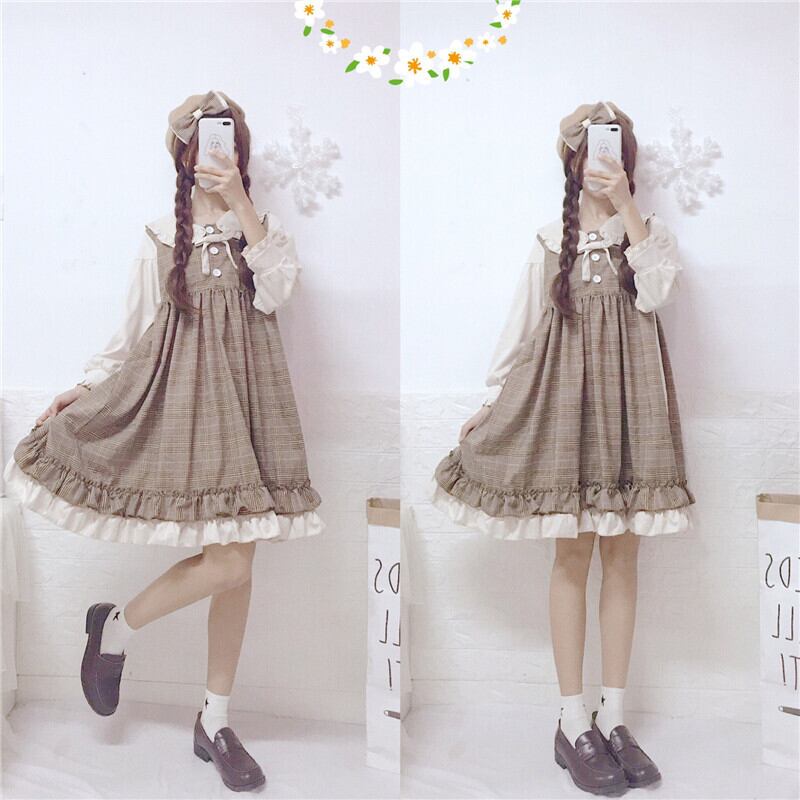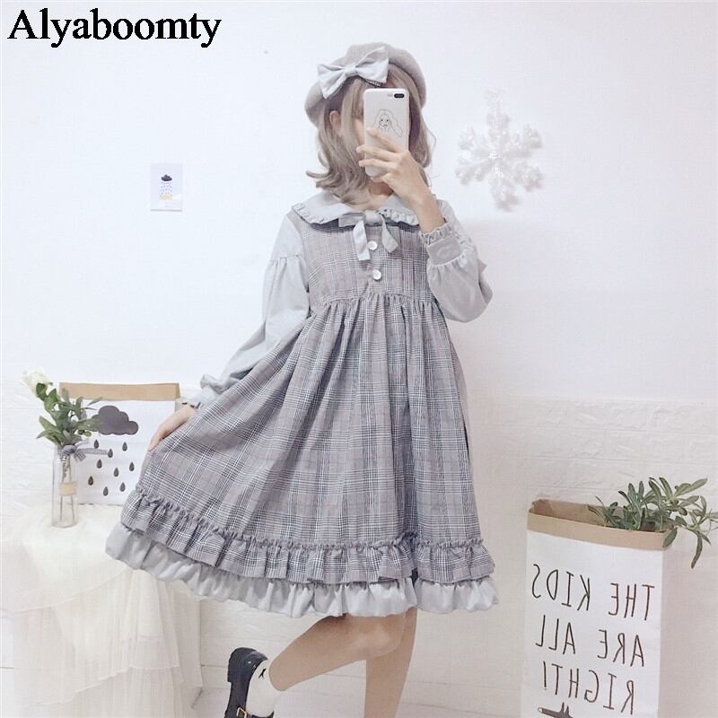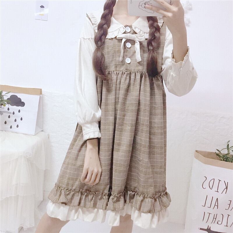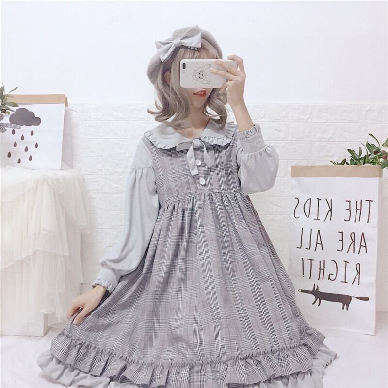 送料無料୨♥୧ スタイルスプリングオータムレディースドレス カラーグレーブラウン格子柄リボンフリル ラッフル 大人ガーリー スウィート キュート カジュアル 春物 秋物 AOS70559195920