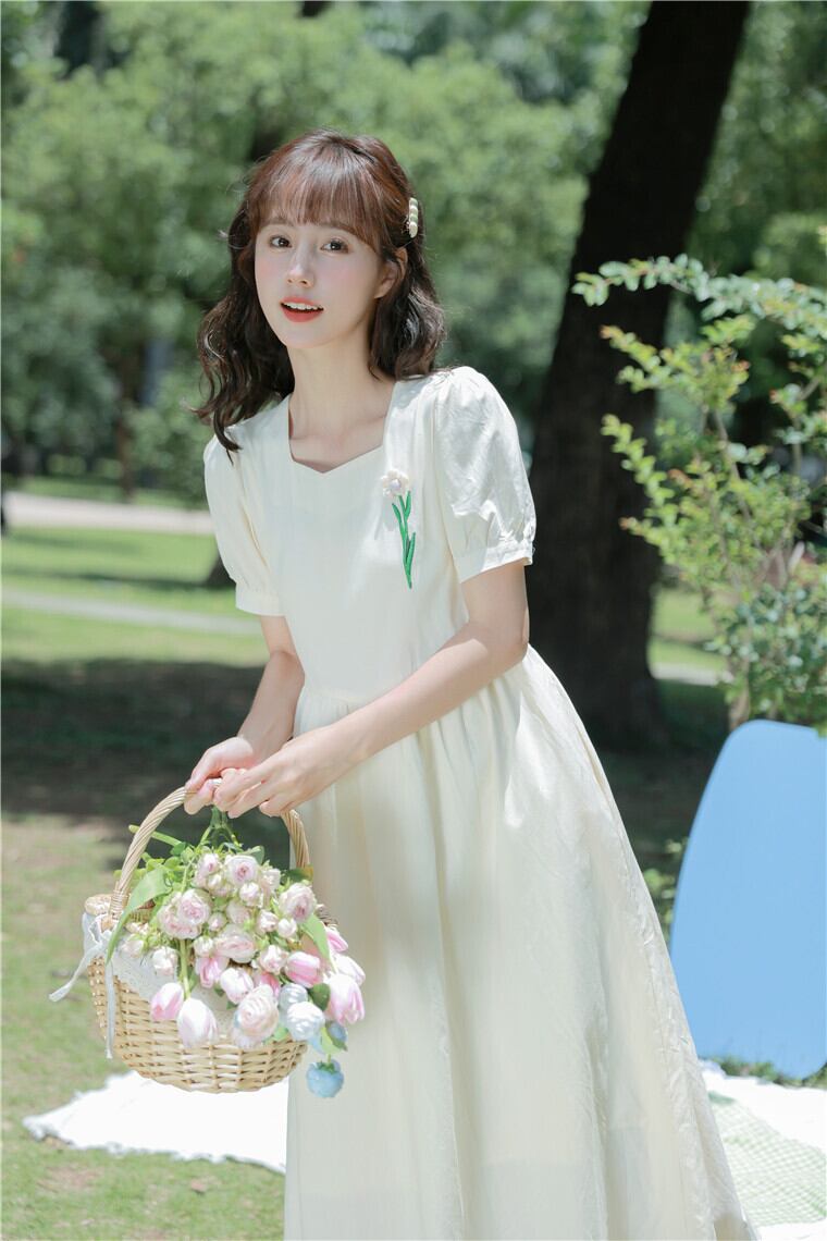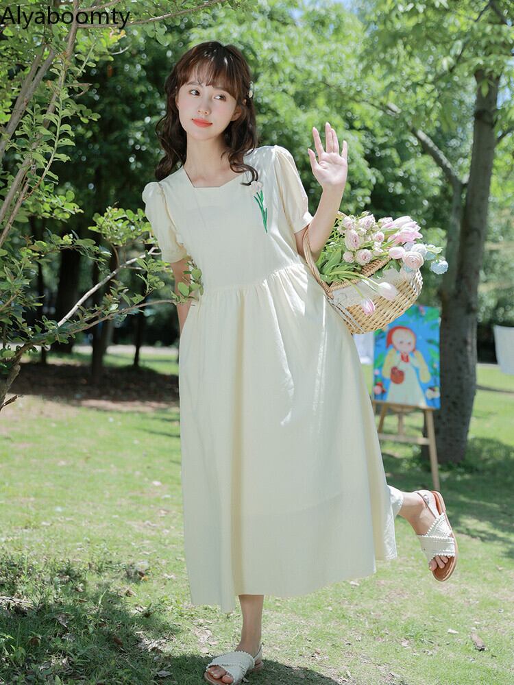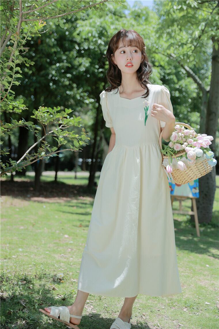 送料無料୨♥୧ サマーレディースミディドレス カラールーズ刺繍スリーブフローラルヴィンテージ コットン 大人ガーリー スウィート キュート カジュアル 夏物 花柄 スクウェア ビンテージ AOS19181241230