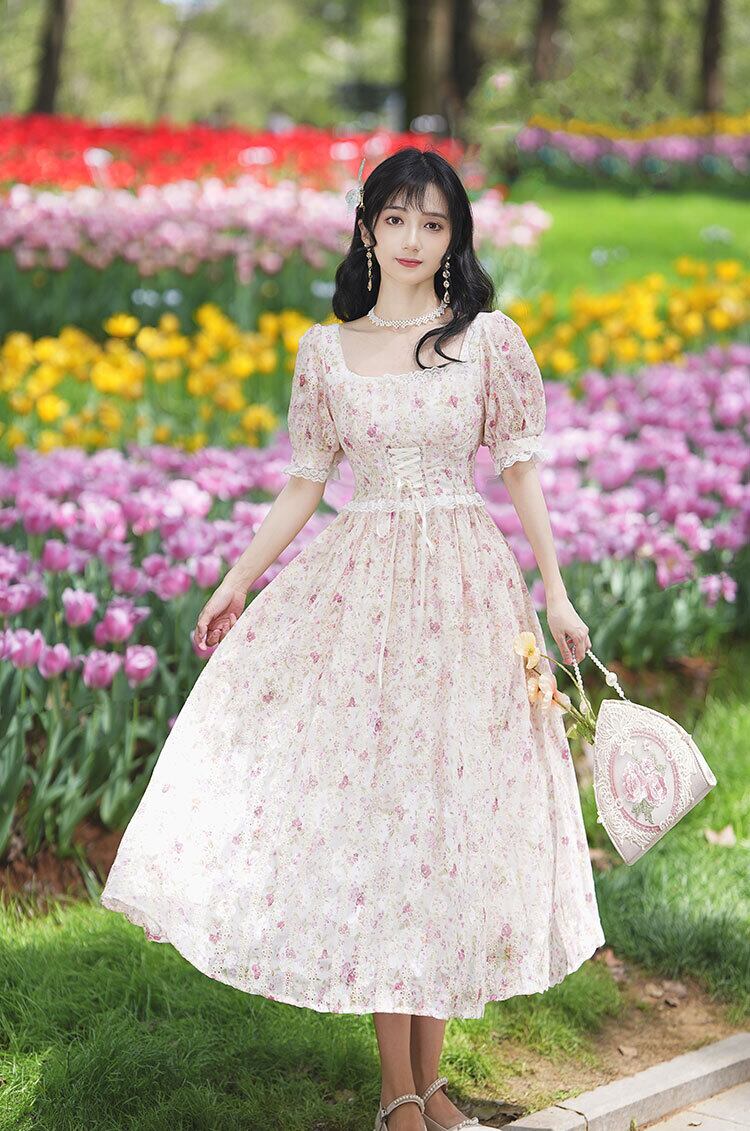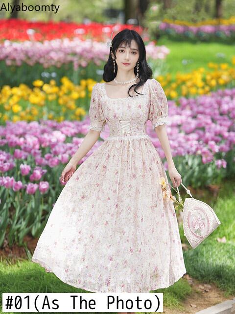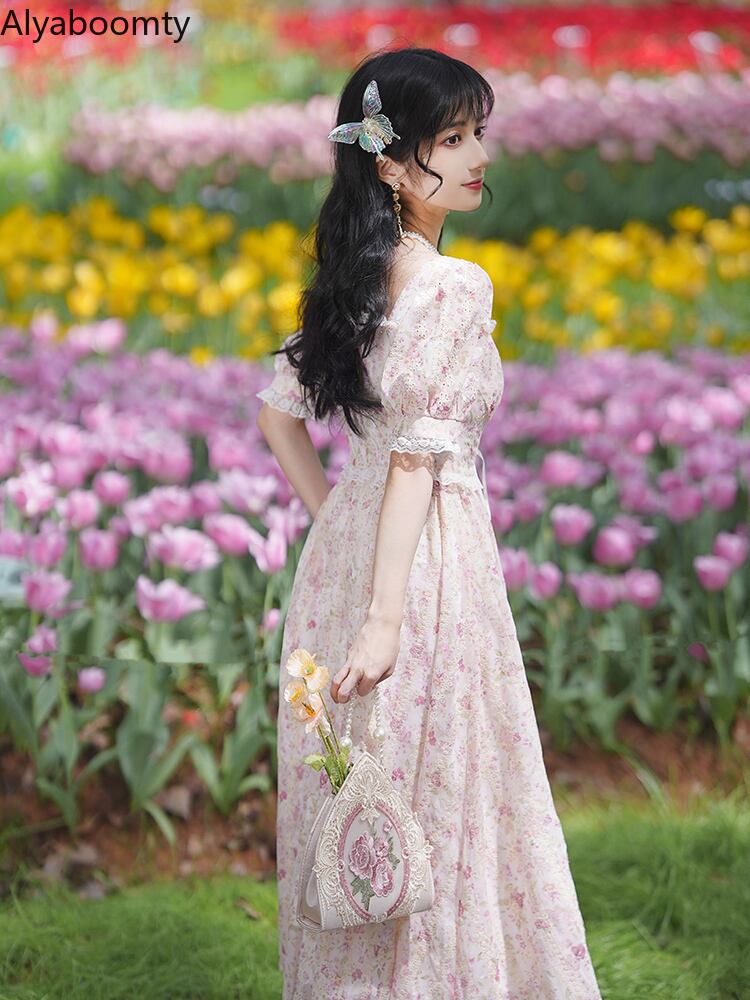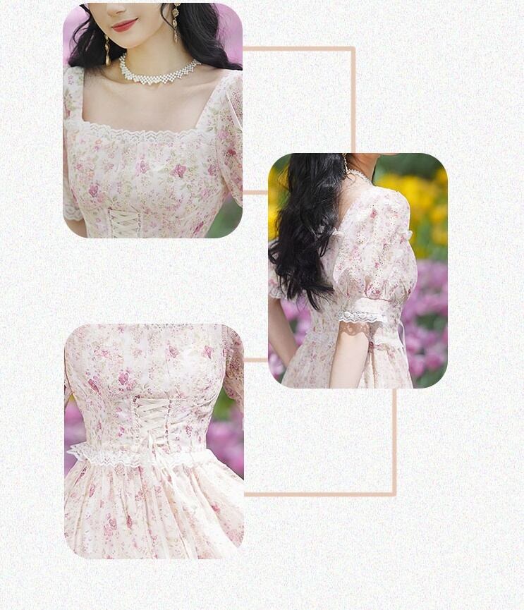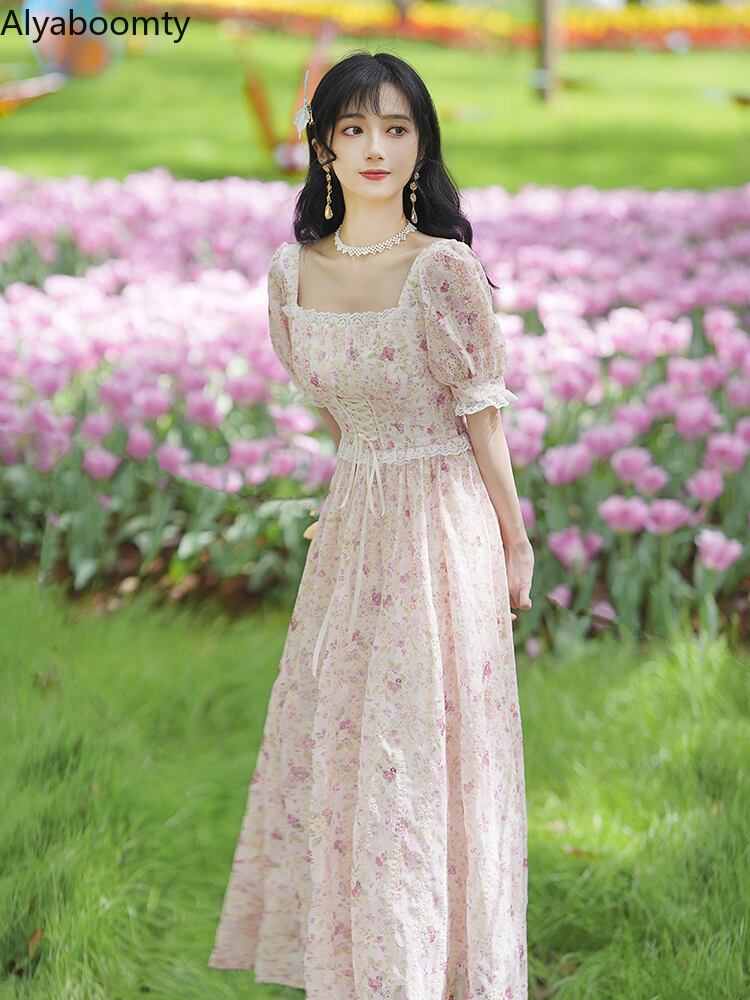 送料無料୨♥୧ サマーレディースロングドレス カラースリーブバンドフローラルプリント 大人ガーリー スウィート キュート カジュアル 夏物 花柄 フラワーデザイン スクウェア AOS62912310934