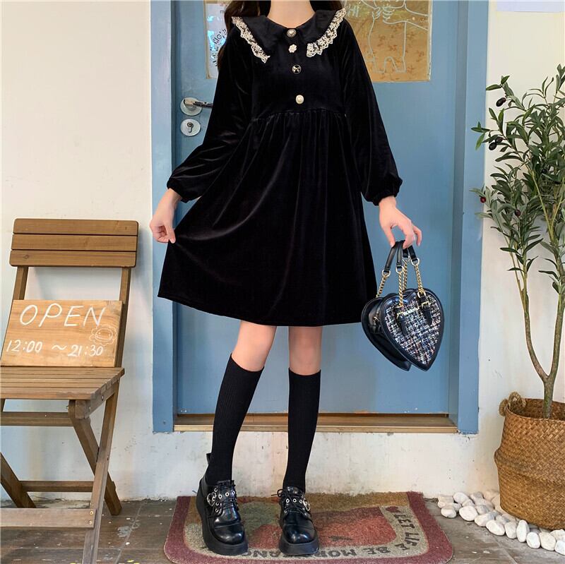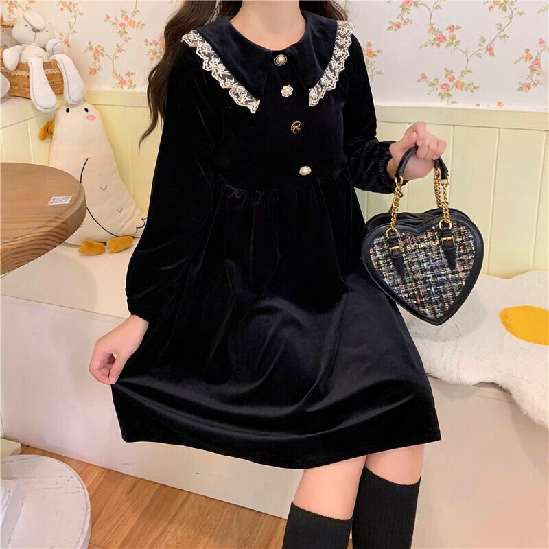 送料無料୨♥୧ スタイルスプリングレディースミニドレス カラーレースブラックベルベット長袖スリーブ ロング 春物 AOS70650803775