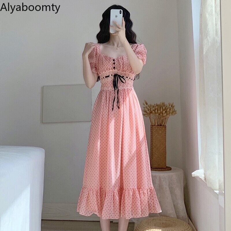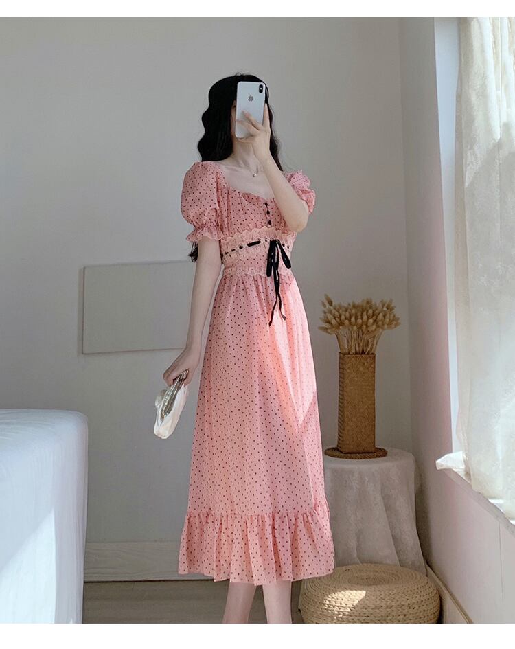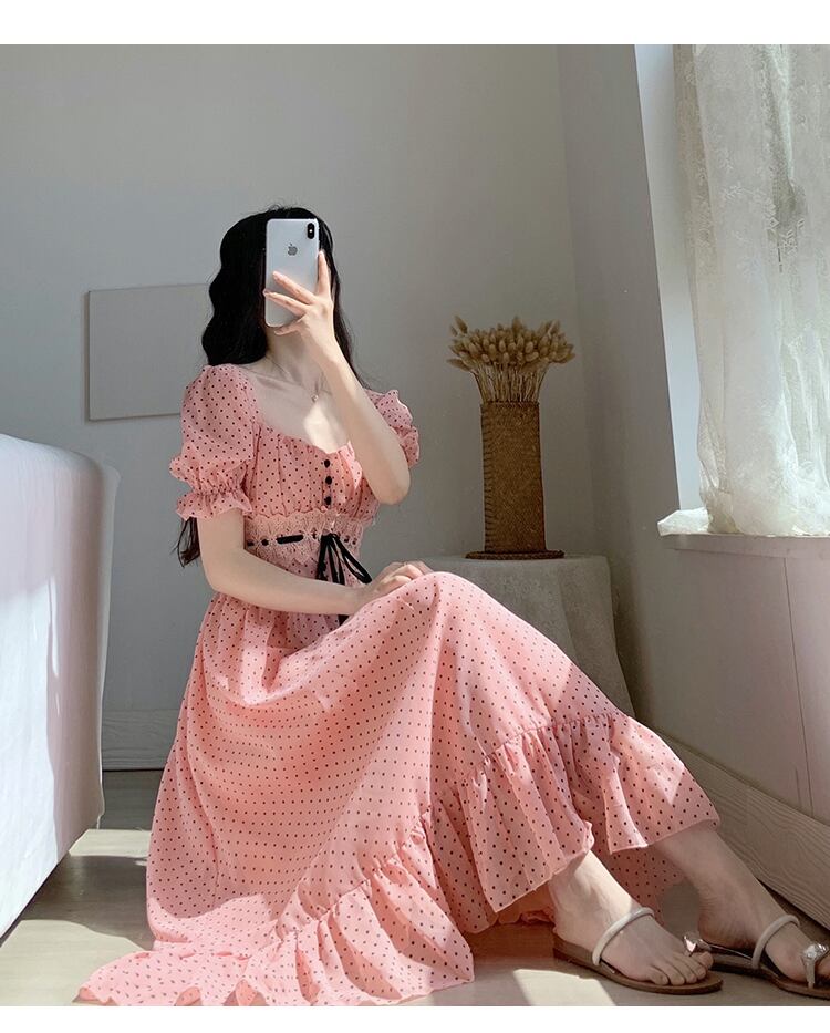 送料無料୨♥୧ サマーレディースロングドレス カラー水玉バンドフリルシフォン ピンク ラッフル 夏物 ビーチ スクウェア AOS36851129870