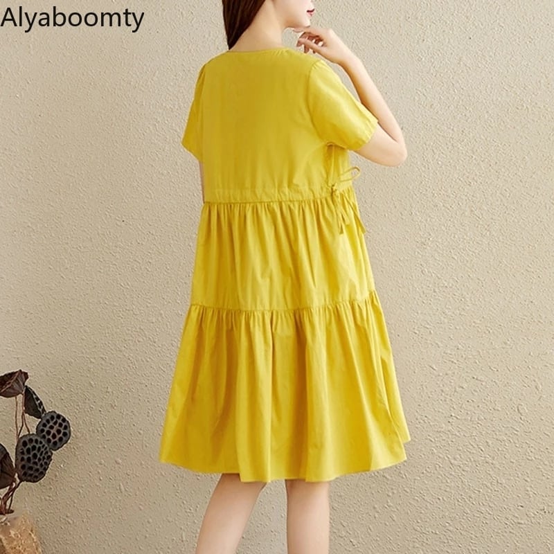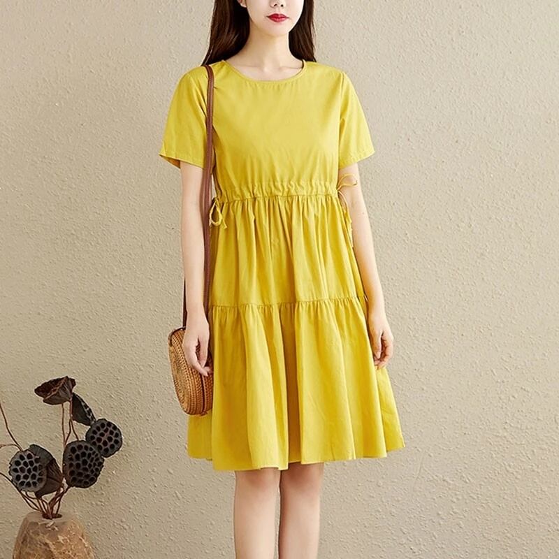 送料無料୨♥୧ サマーレディースベーシックソリッド ドレス イエローブルー半袖スリーブレースルーズフリル ショート レッド コットン ハーフスリーブ ラッフル 大人ガーリー スウィート キュート カジュアル 夏物 Oネック レースアップ ソリッドカラー AOS31491812271