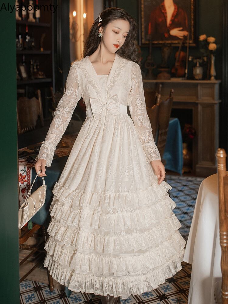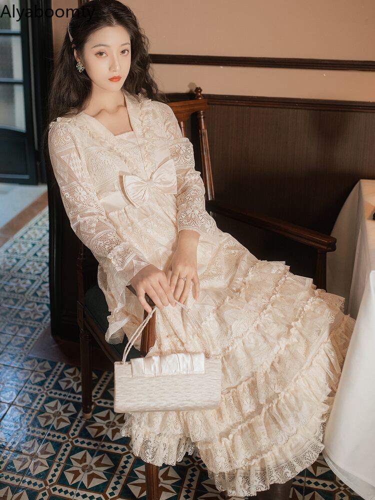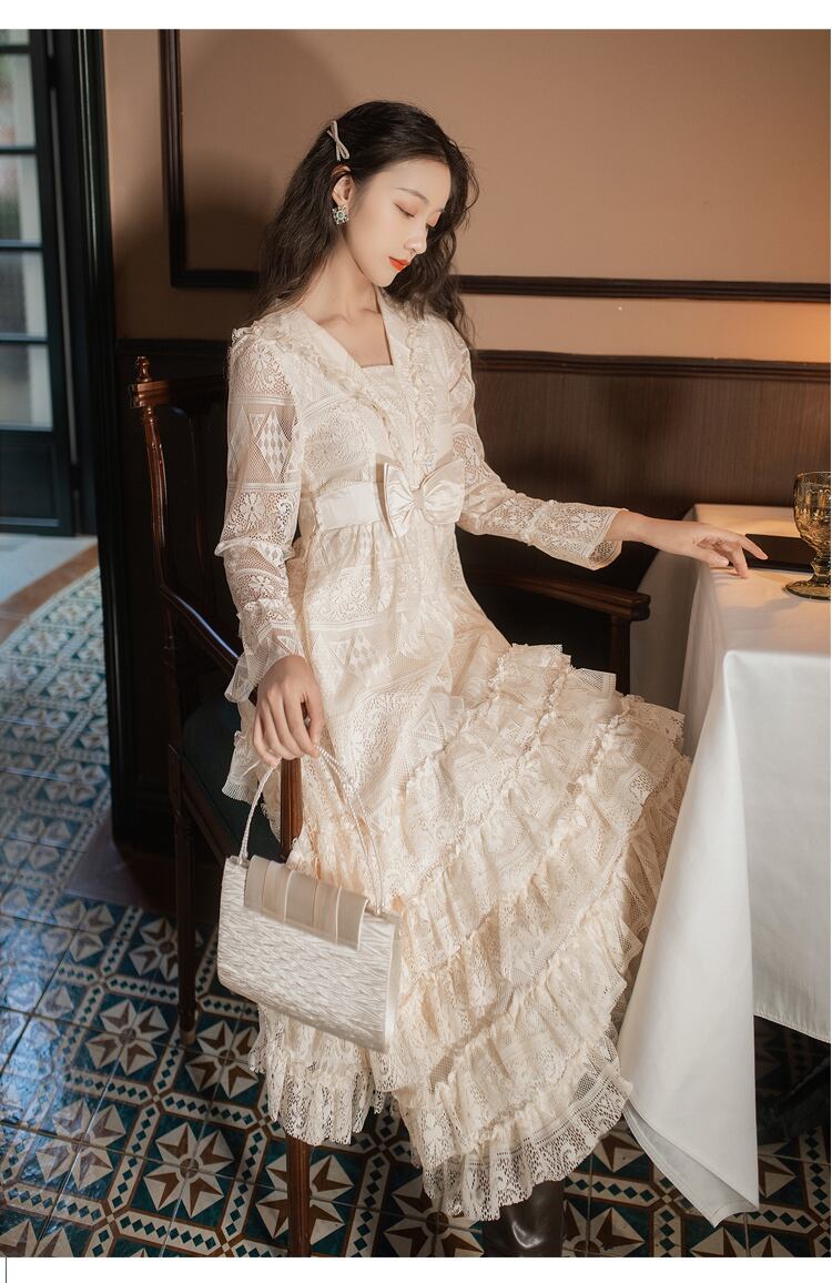 送料無料୨♥୧ スプリングオータムレディースロングドレス Vネックリボンフローラル長袖スリーブフリル レッド ラッフル 春物 秋物 花柄 AOS31155415508