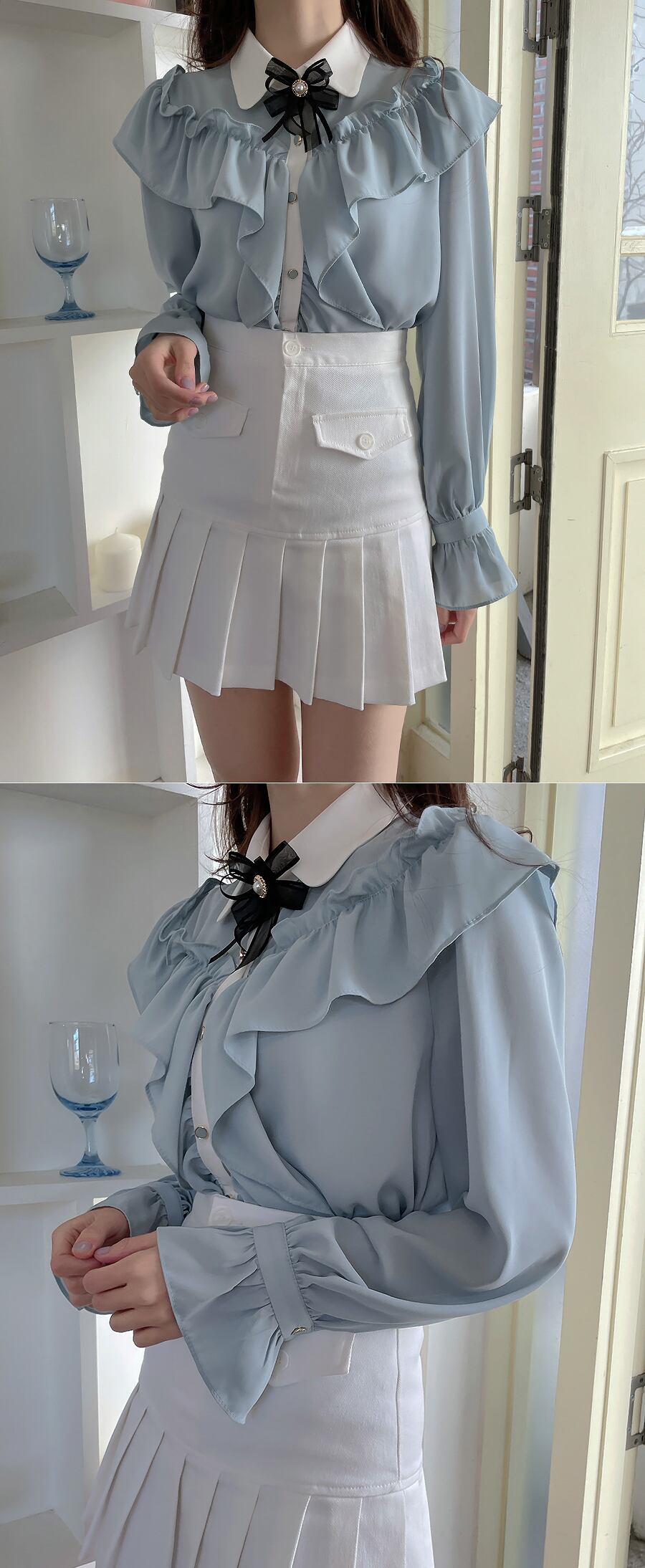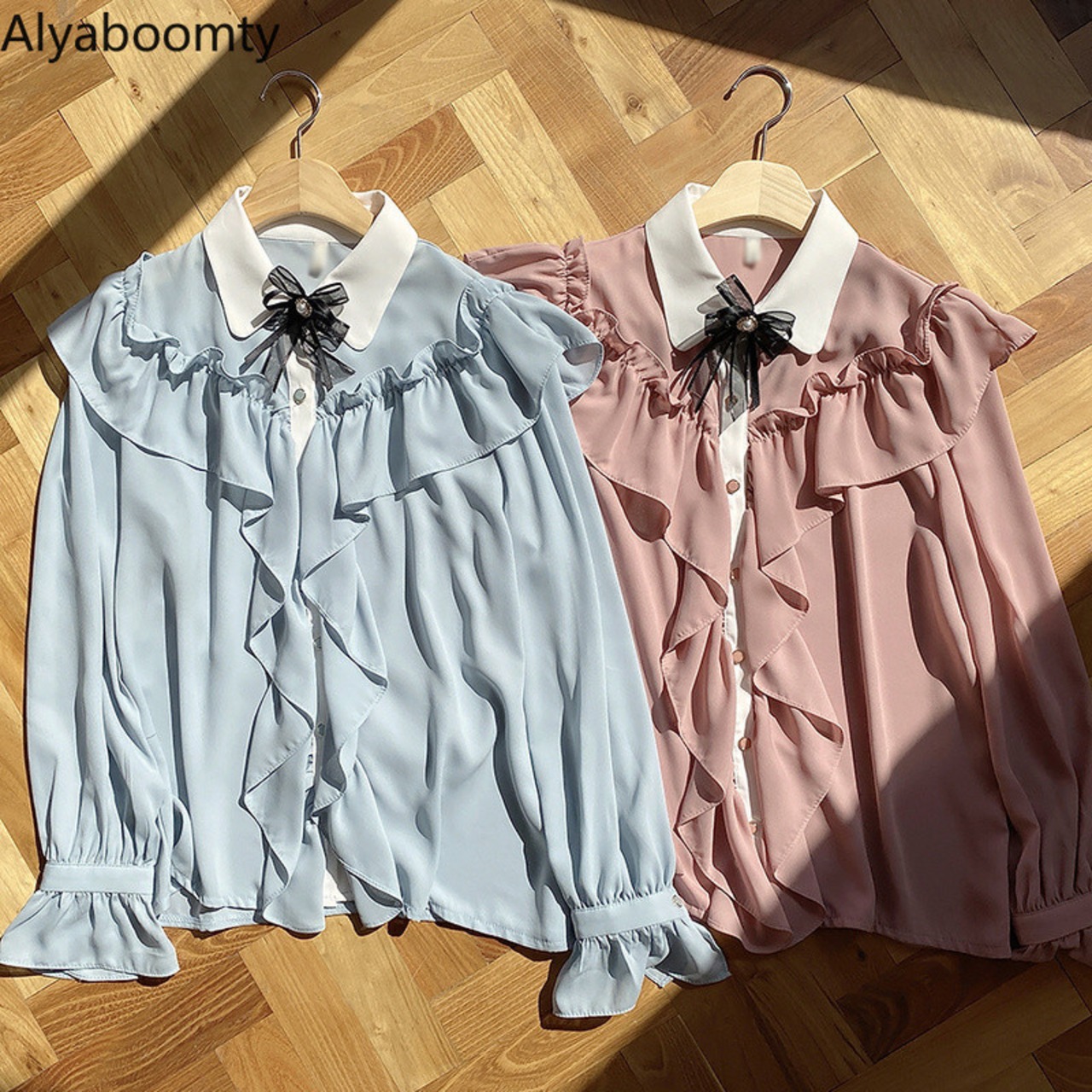 送料無料୨♥୧ スプリングオータムレディースブラウス カラーブルーリボンフリルシャツ ピンク ラッフル 大人ガーリー スウィート キュート カジュアル 春物 秋物 AOS96518432312