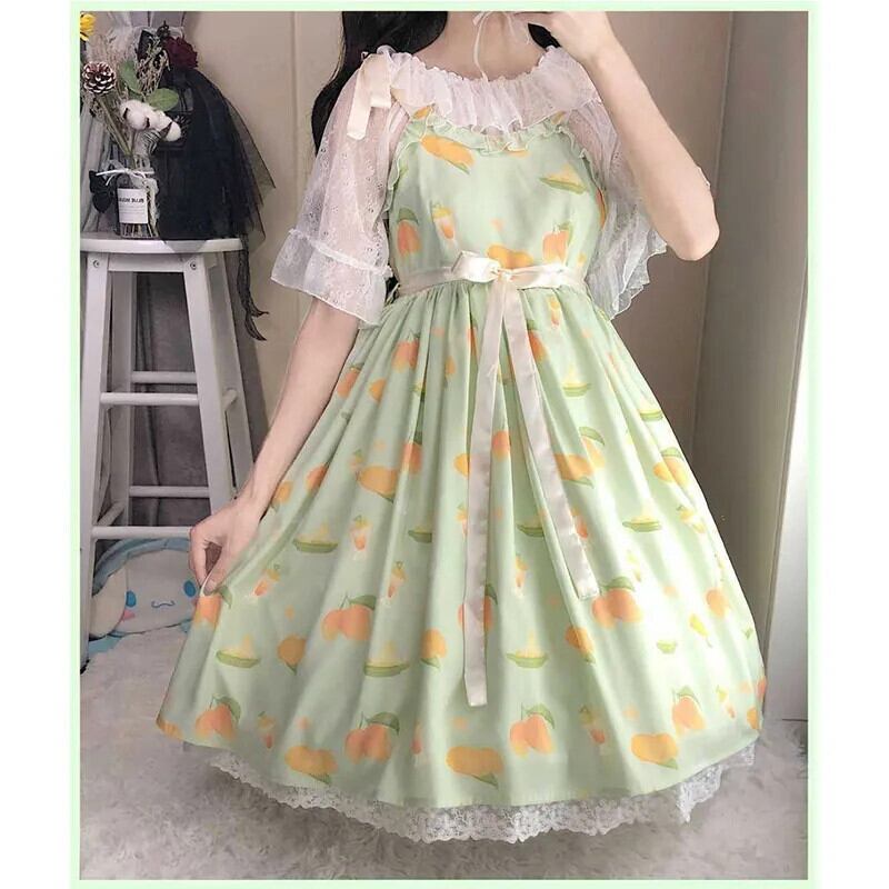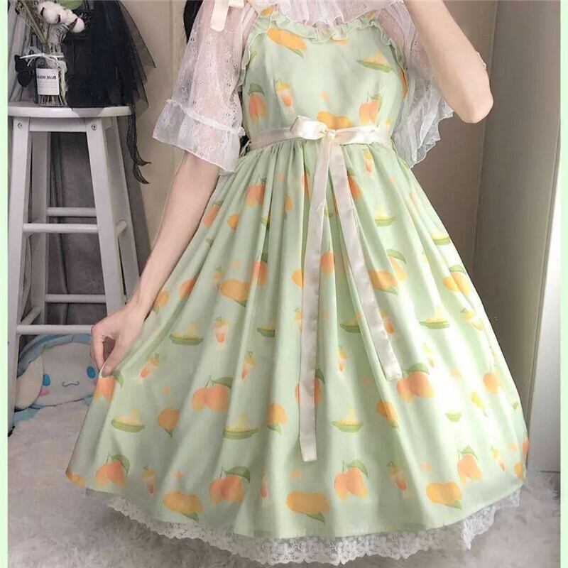 送料無料୨♥୧ サマーレディースドレス プリント柄オレンジグリーンベージュリボンレースフリルノースリーブ ラッフル 夏物 AOS582932831