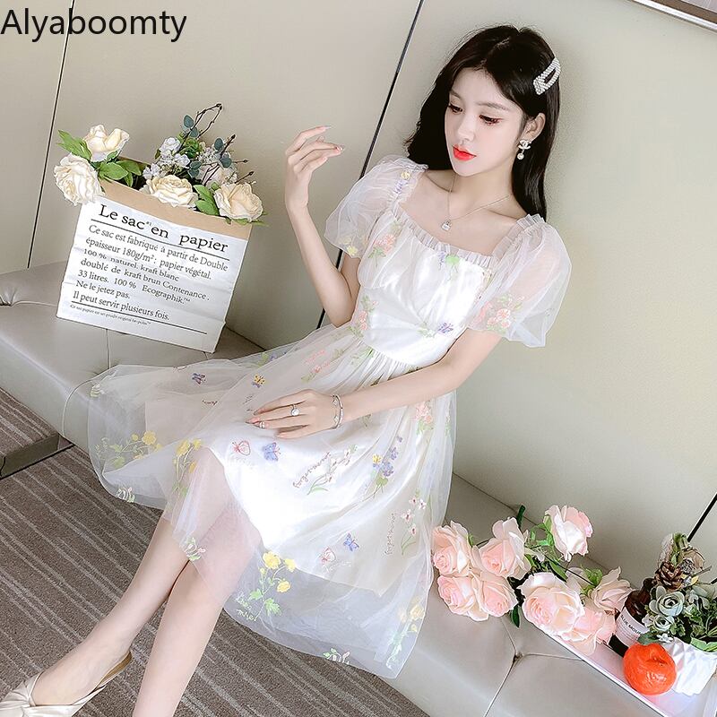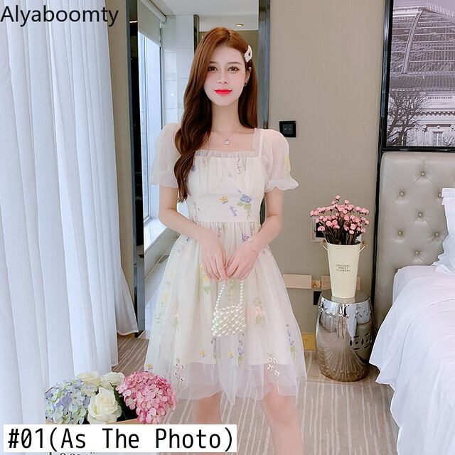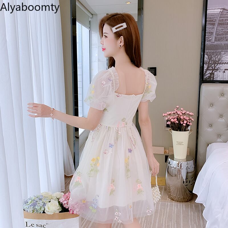送料無料୨♥୧ サマーレディースメッシュドレス カラーフローラル刺繍半袖スリーブ ショート ハーフスリーブ 大人ガーリー スウィート キュート カジュアル 夏物 花柄 スクウェア AOS88655769436