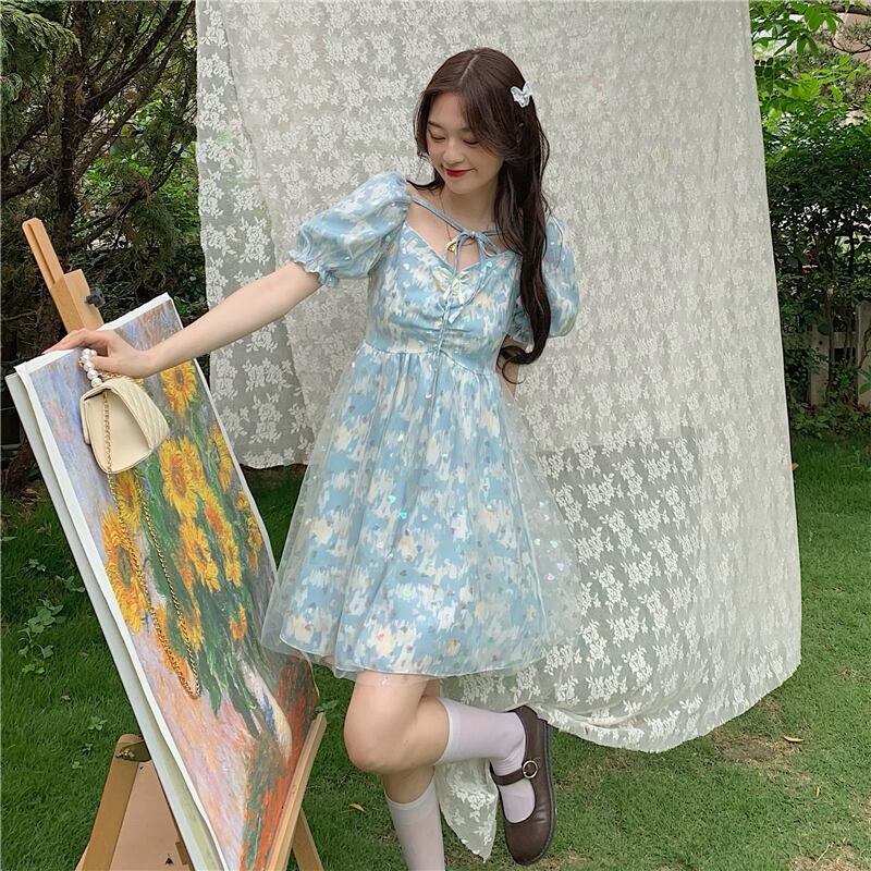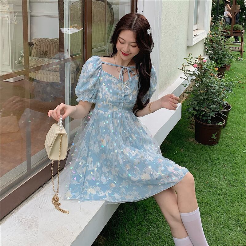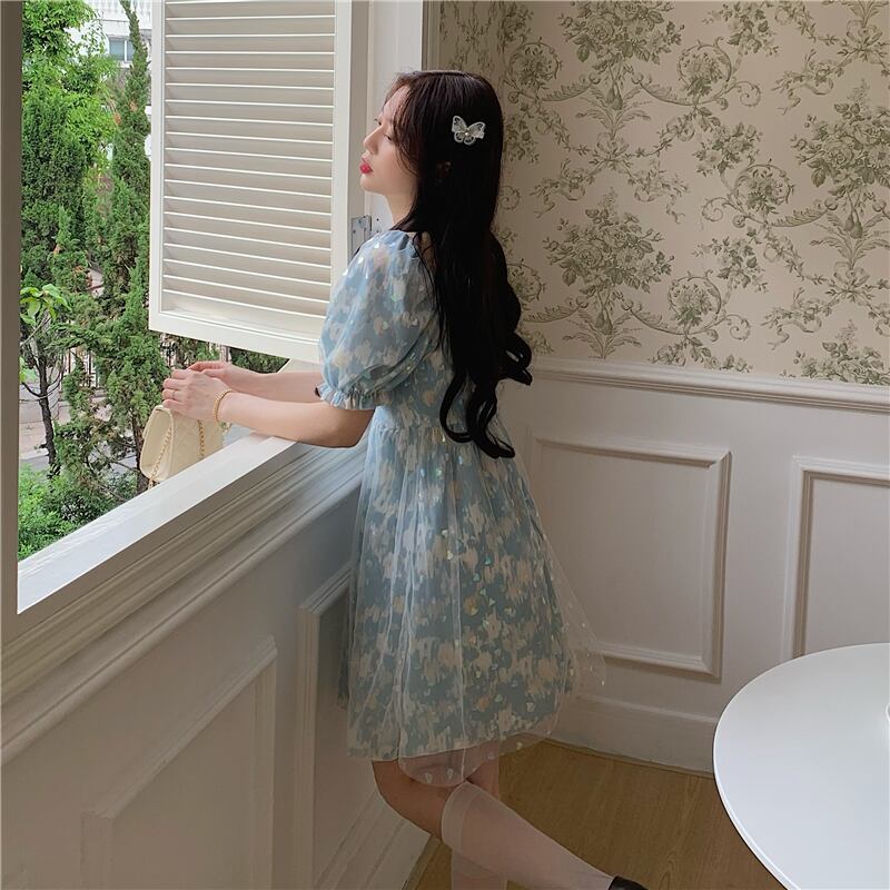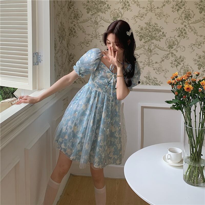 送料無料୨♥୧ サマーレディースメッシュドレス Vネックハートフローラルプリントバンドスリーブ 夏物 花柄 AOS49765555828
