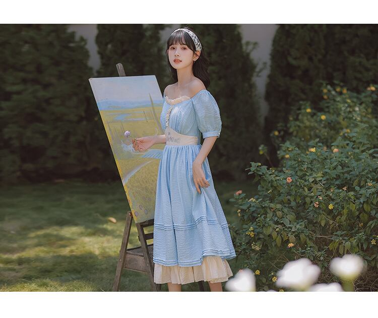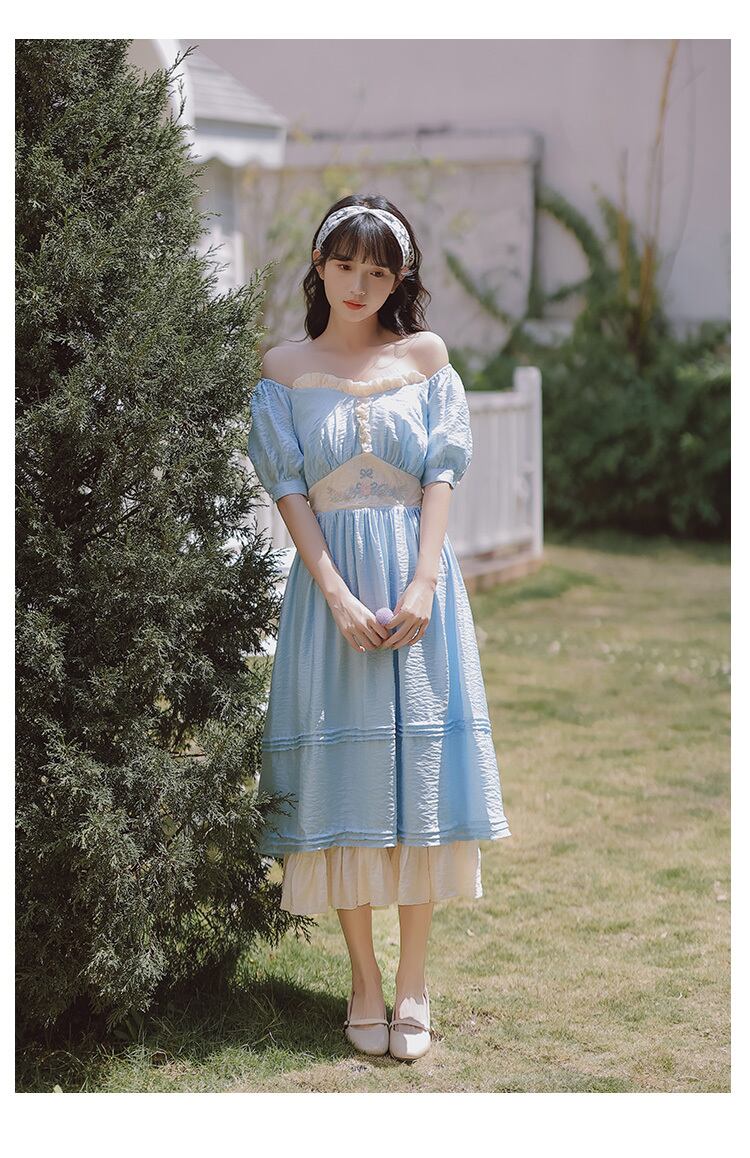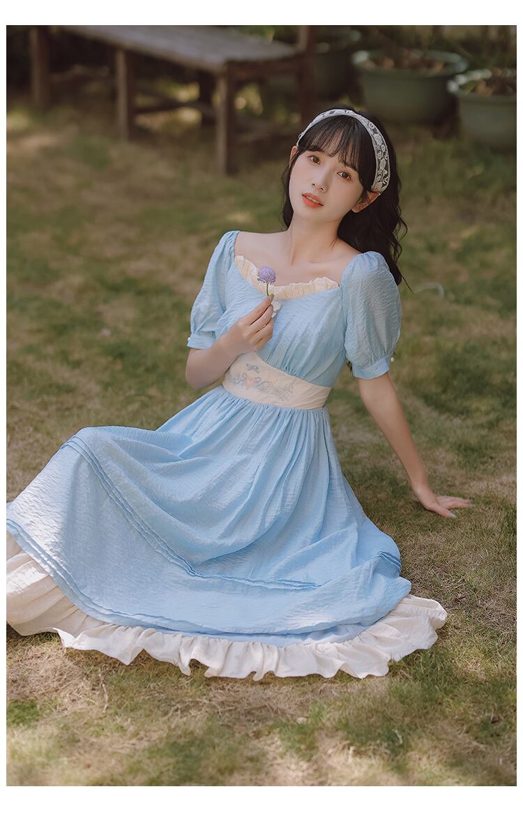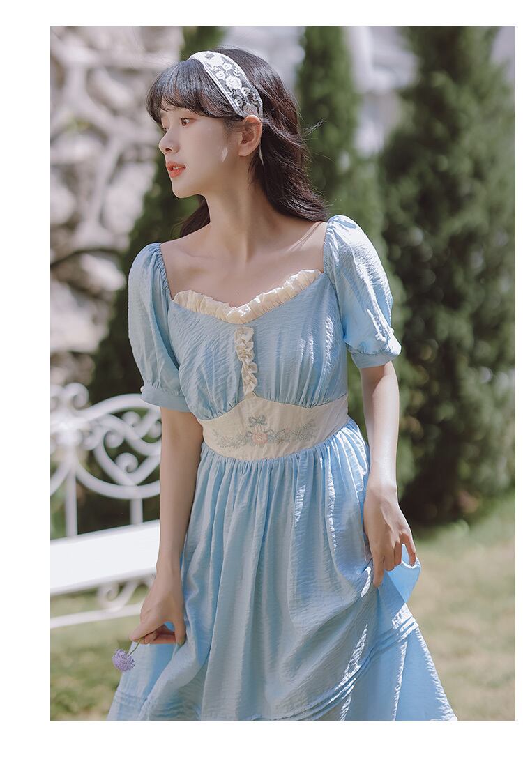 送料無料୨♥୧ サマーレディースフリルドレス カラーフローラル刺繍ブルーロング ラッフル 大人ガーリー スウィート キュート カジュアル 夏物 花柄 スクウェア AOS6113714719