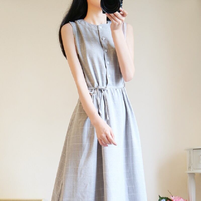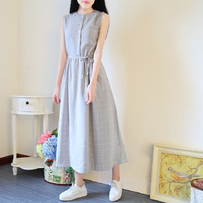 送料無料୨♥୧ サマーレディースノースリーブロングドレス スタンドカラーカラーブルーグレー格子柄 コットン 大人ガーリー スウィート キュート カジュアル 夏物 AOS74983186050