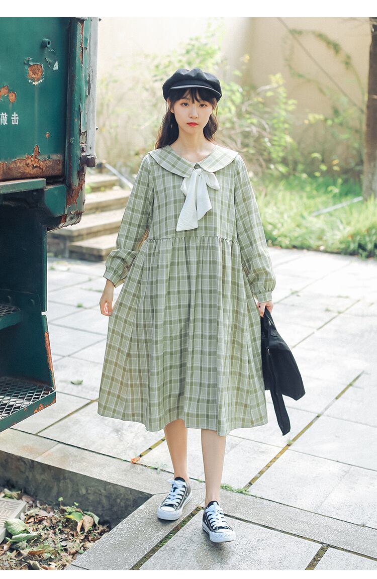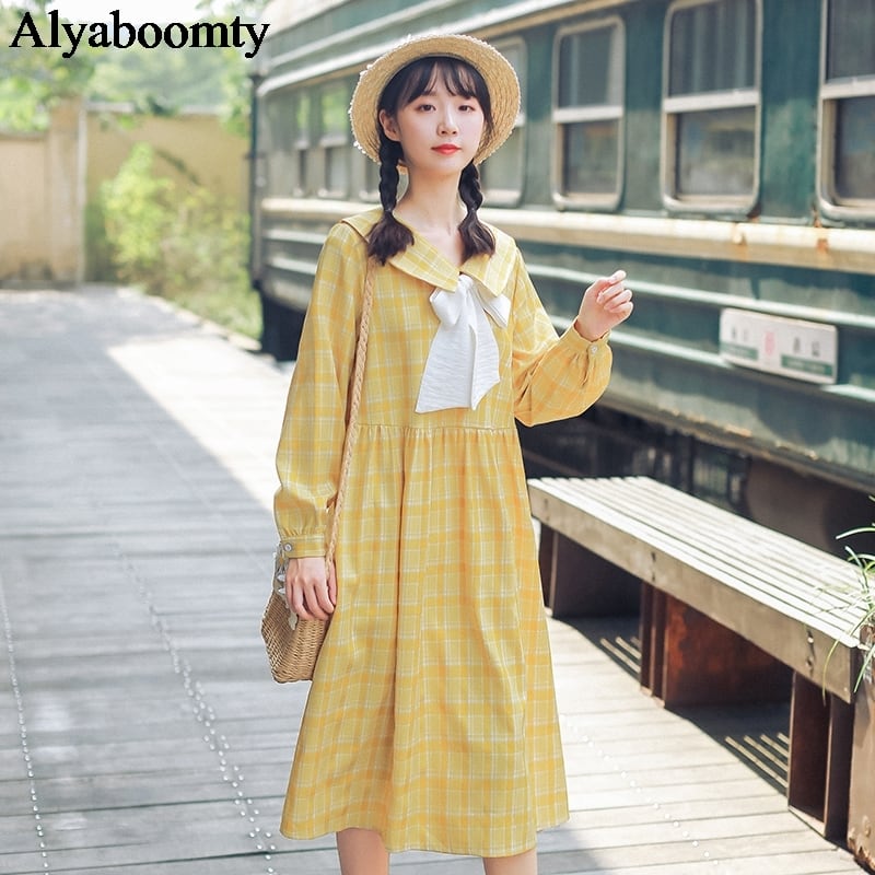 送料無料୨♥୧ ミディレディースドレス イエローグリーン格子柄ルーズオータムスプリングスタイルリボンドレス ワンピース ロング 大人ガーリー スウィート キュート カジュアル 春物 秋物 AOS69868200002