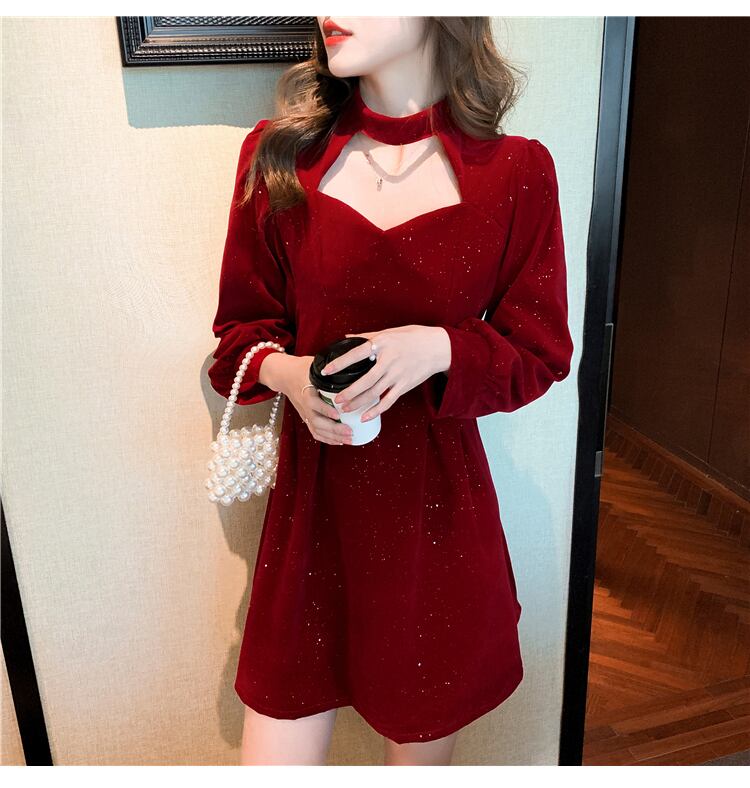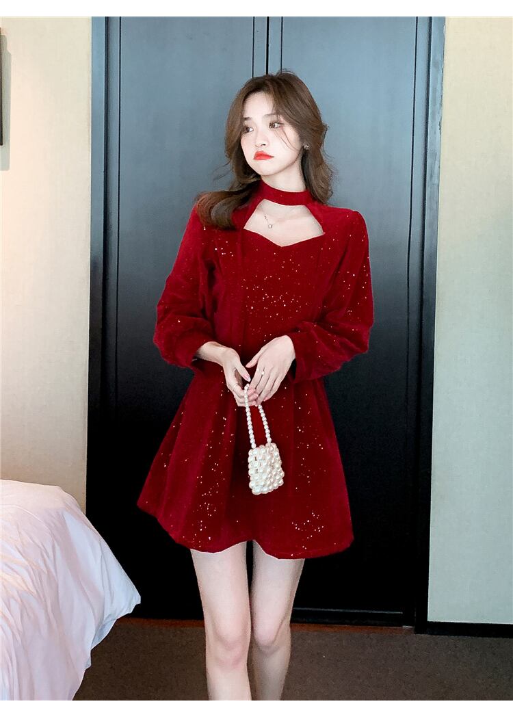 送料無料୨♥୧ スプリングオータムレディースミニドレス ホルターレッドブラックベルベット 春物 秋物 AOS62719133264