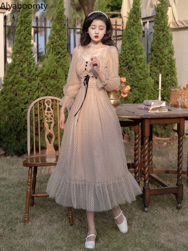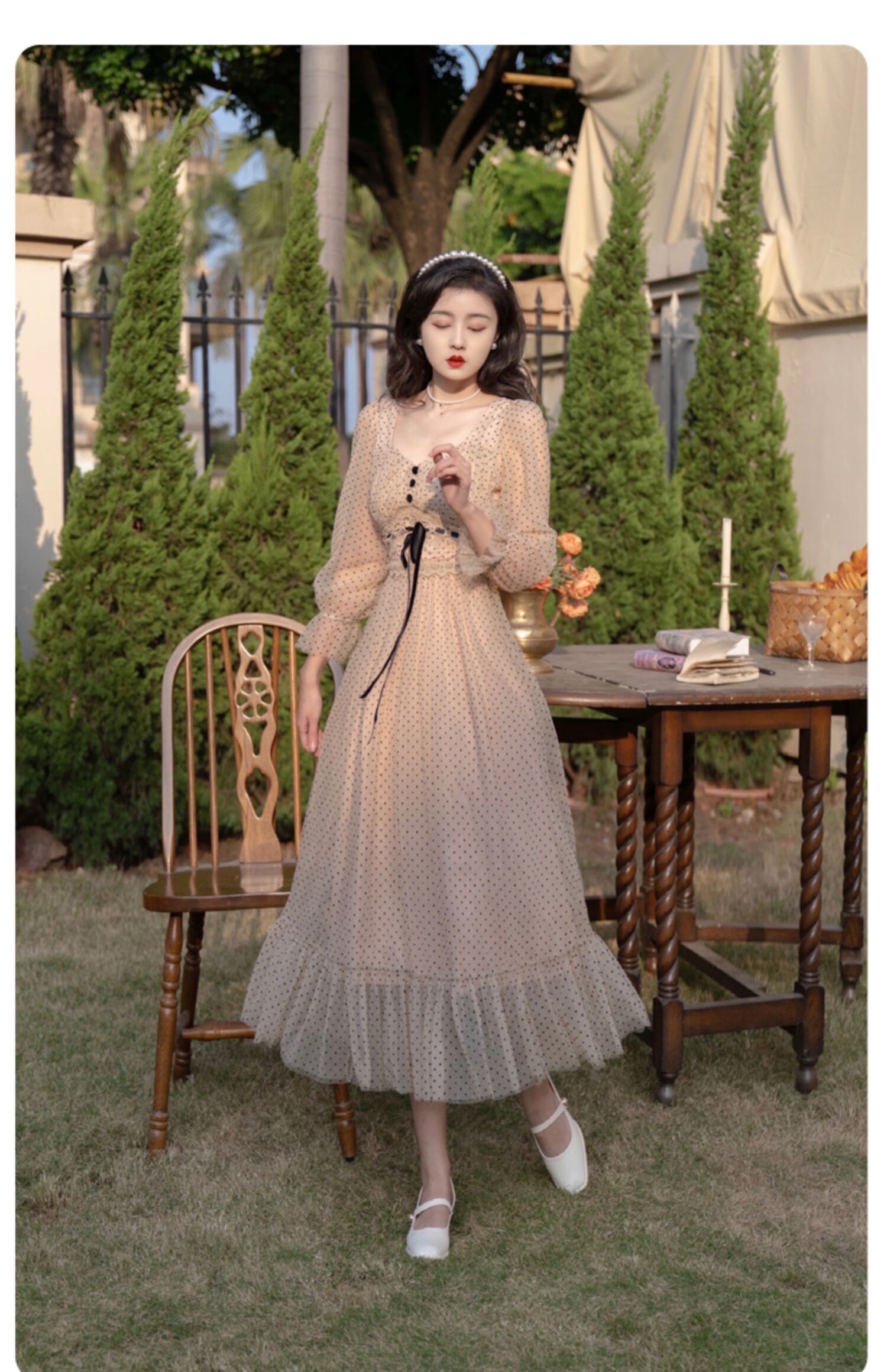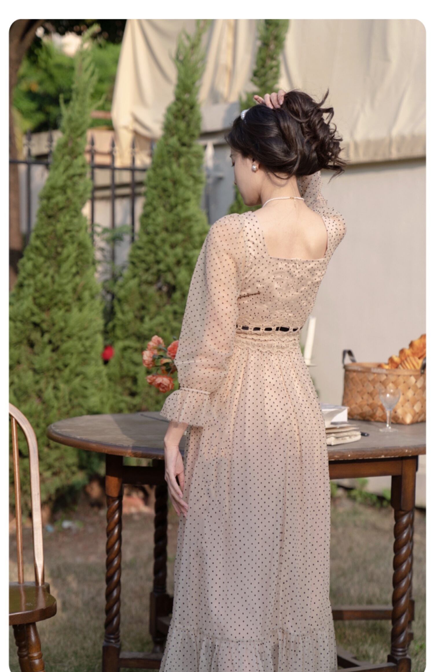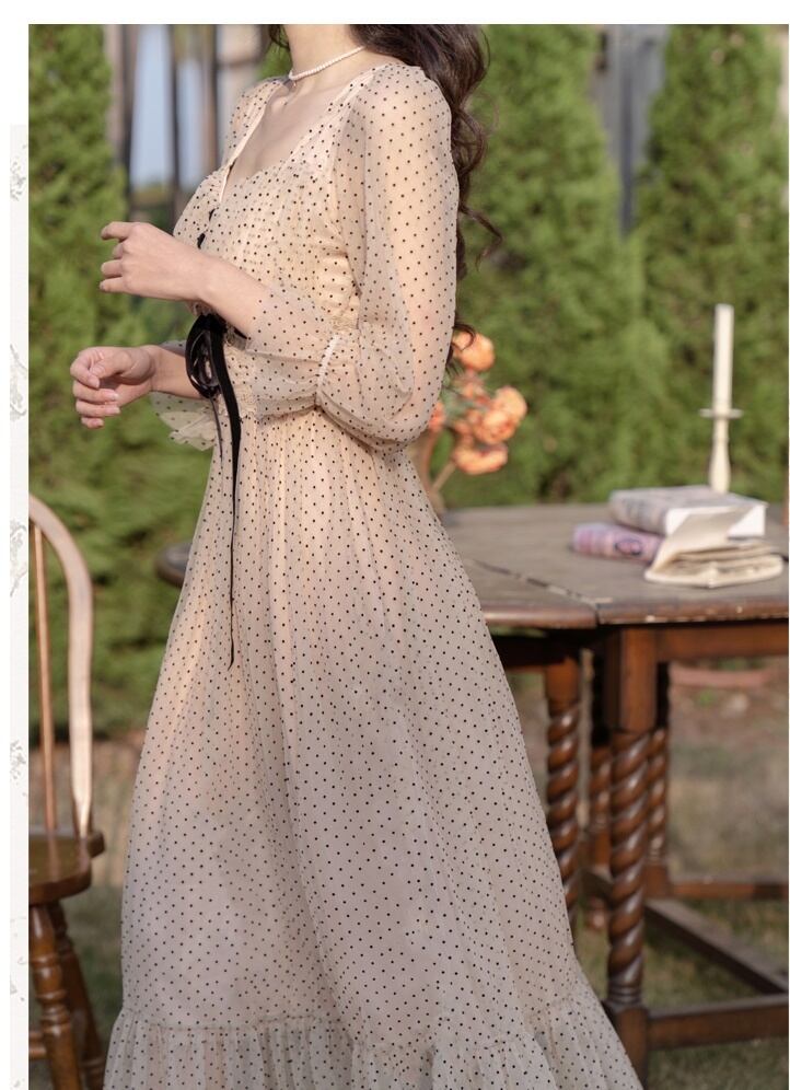 送料無料୨♥୧ スプリングオータムレディースミディドレス カラーカーキ水玉レースメッシュフリル ラッフル 春物 秋物 スクウェア AOS442272185