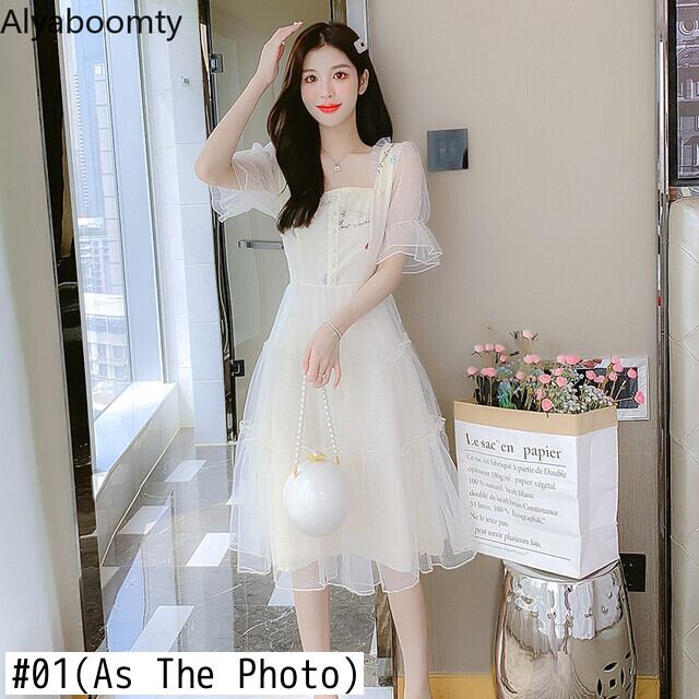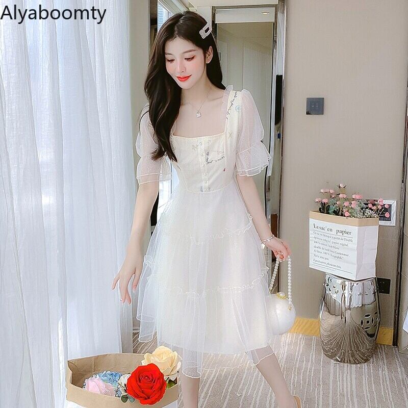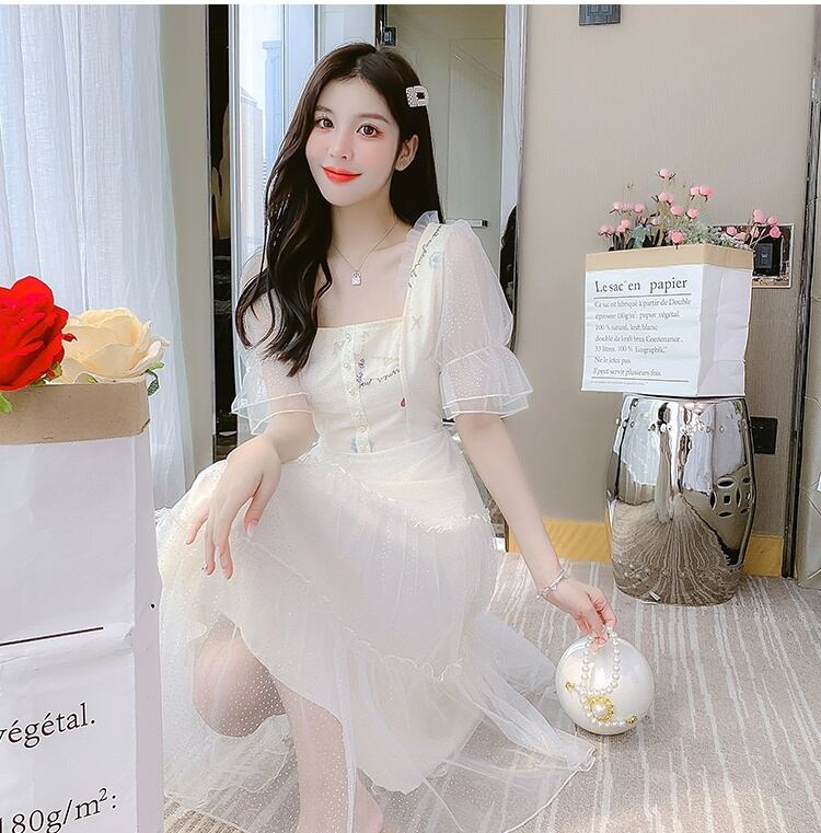 送料無料୨♥୧ サマーレディースドレス カラーフローラル刺繍メッシュスリーブフリル フレアスリーブ ラッフル 大人ガーリー スウィート キュート カジュアル 夏物 花柄 スクウェア AOS77288270205