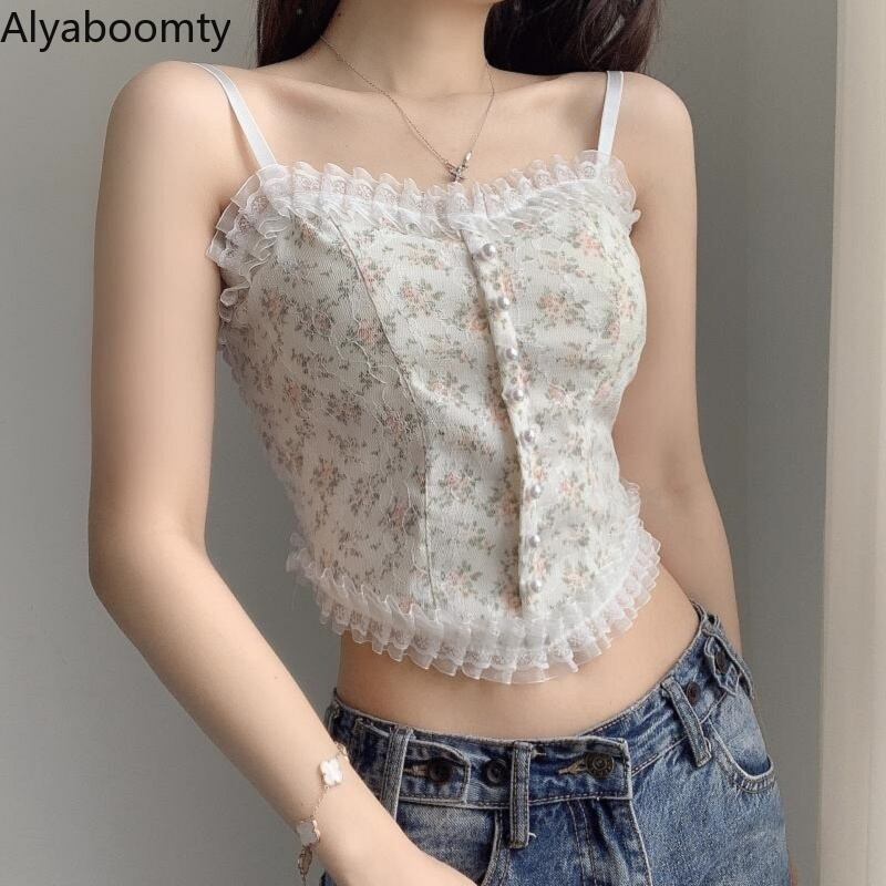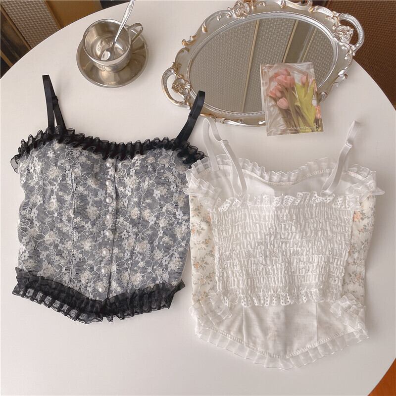 送料無料୨♥୧ サマーレディーススタイルフローラルプリント柄レースクロップトップ トップス ホワイトブラックパールキャミストリートウェア かわいい 夏物 花柄 真珠 AOS74670865989
