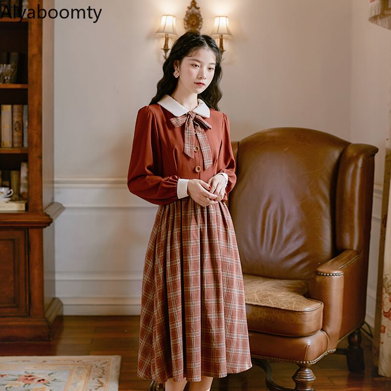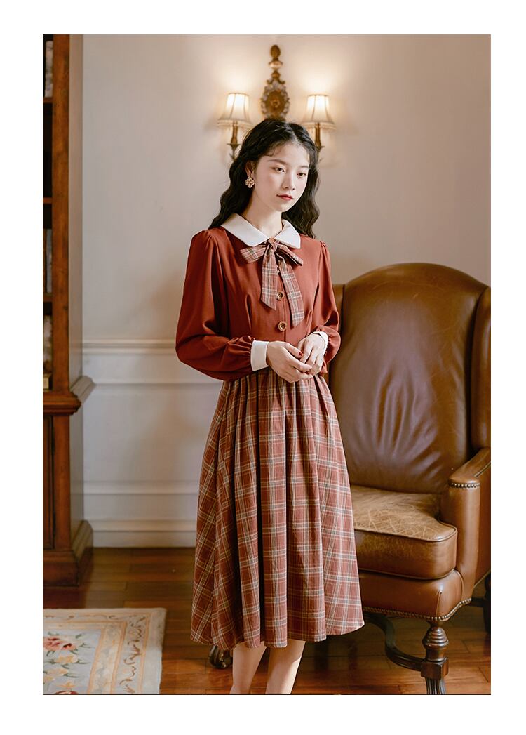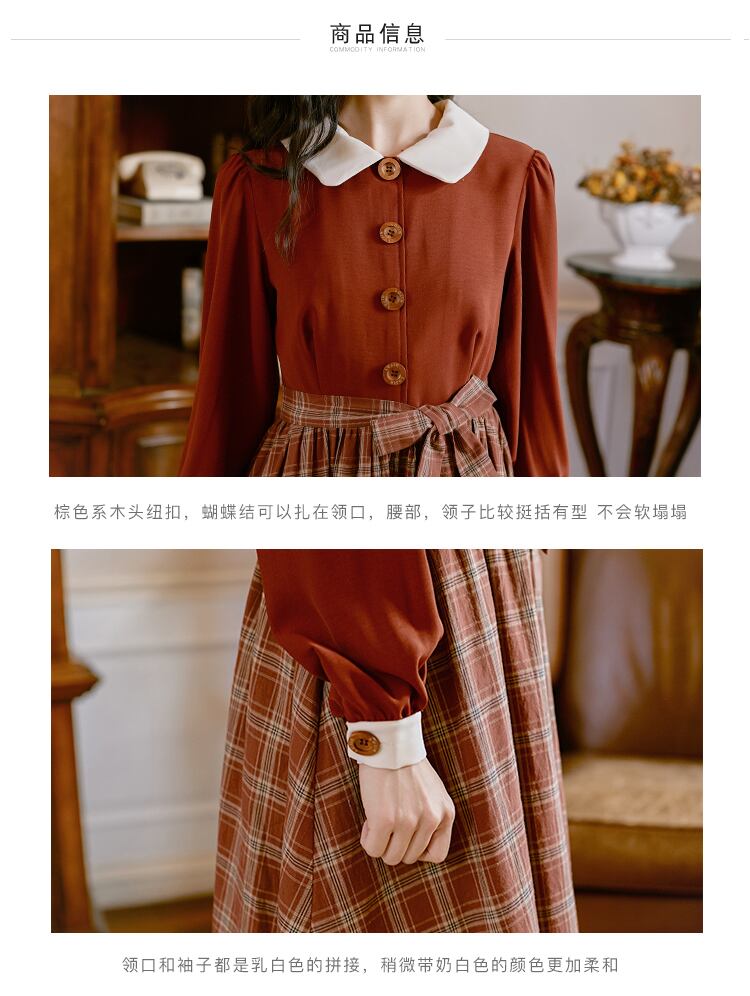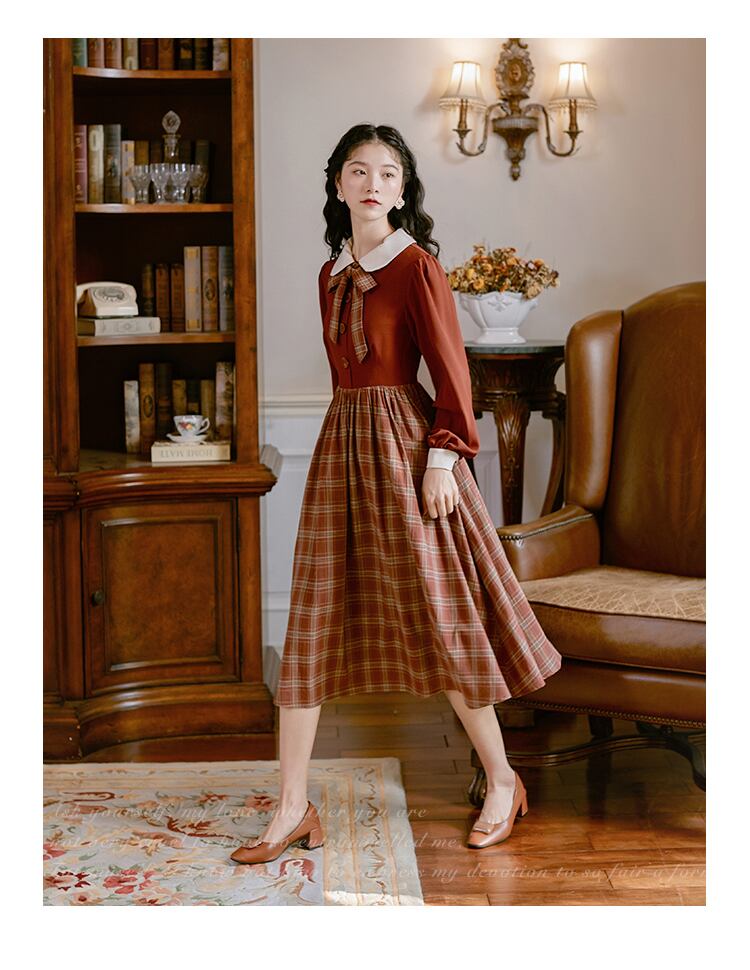 送料無料୨♥୧ スタイルスプリングオータムレディースミディドレス パッチワーク格子柄リボンヴィンテージスリーブ ランタンスリーブ 春物 秋物 ビンテージ ヨーロピアン AOS3857760059