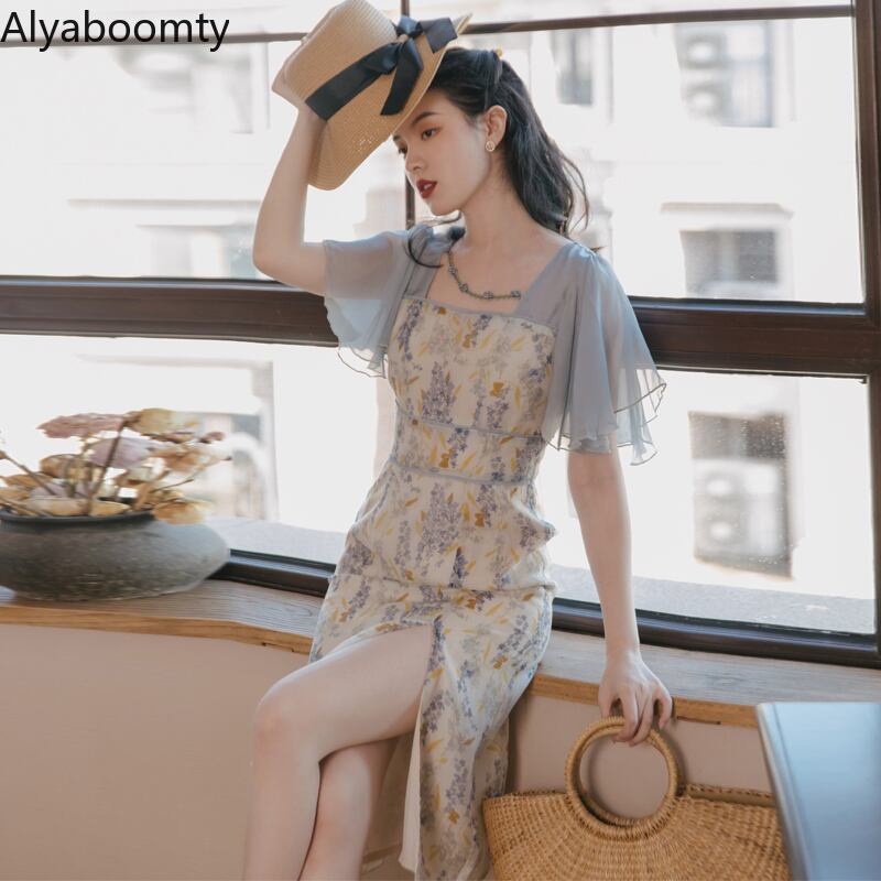 送料無料୨♥୧ サマーレディースヴィンテージAラインドレス カラーフローラルプリントスリーブスタンダード レトロ 夏物 花柄 スクウェア ビンテージ AOS10538371597