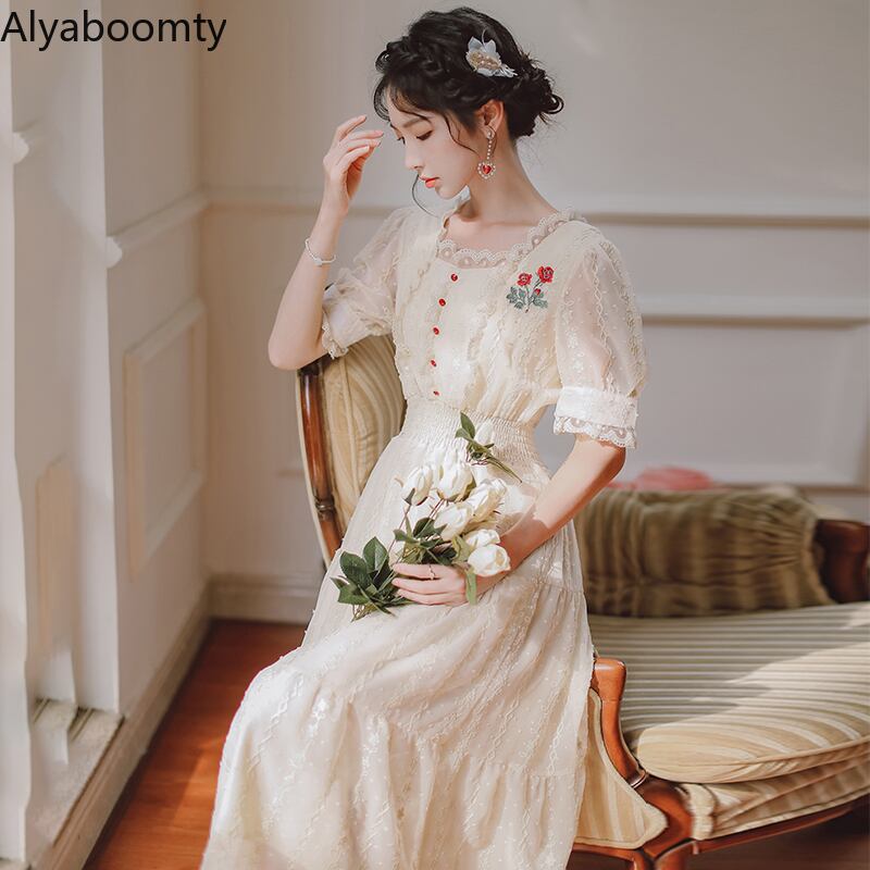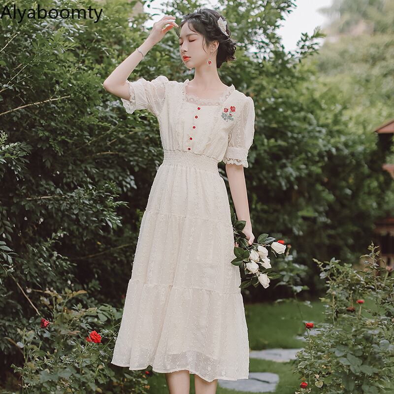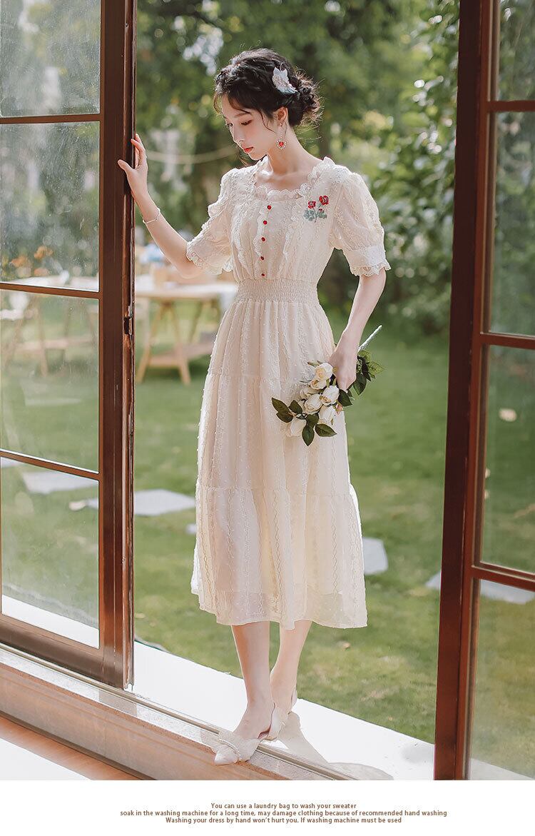 送料無料୨♥୧ サマーレディースロングドレス カラー刺繍ベージュ 大人ガーリー スウィート キュート カジュアル 夏物 スクウェア AOS58331207703