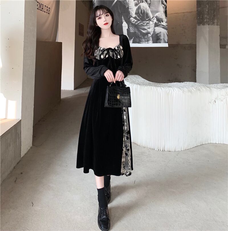 送料無料୨♥୧ スプリングオータムレディースロングブラックドレス カラーパッチワークベルベットレースヴィンテージ 春物 秋物 スクウェア ビンテージ AOS71566046708