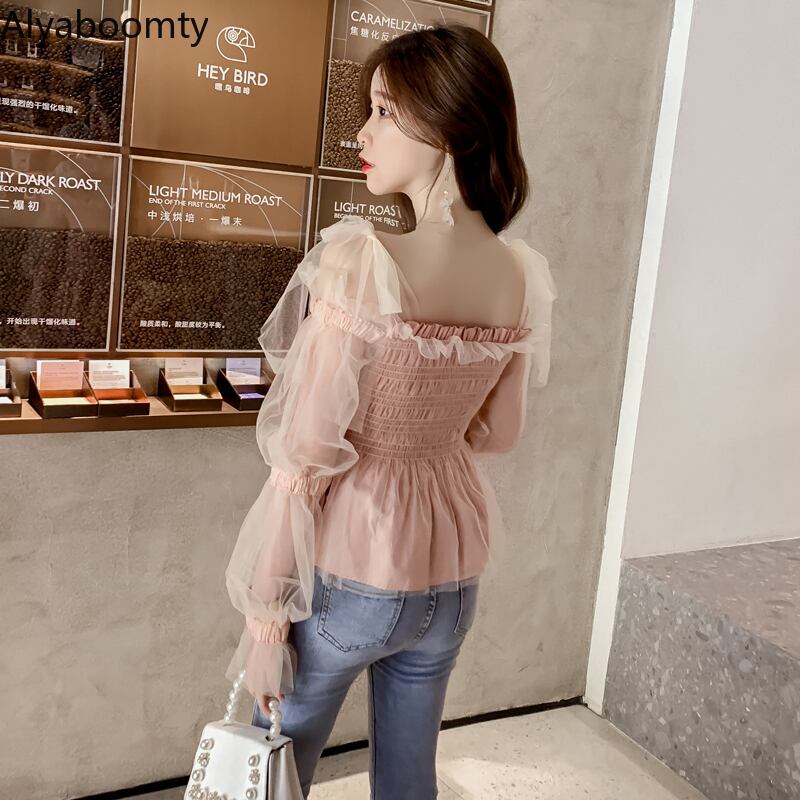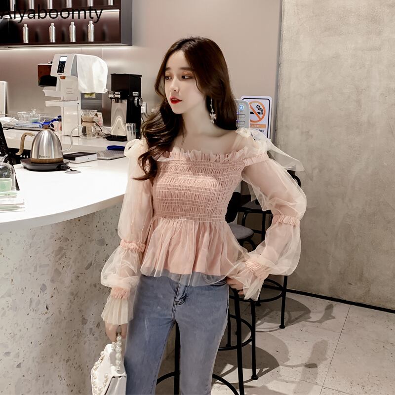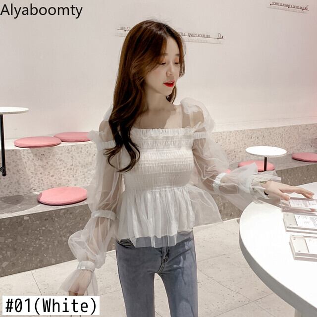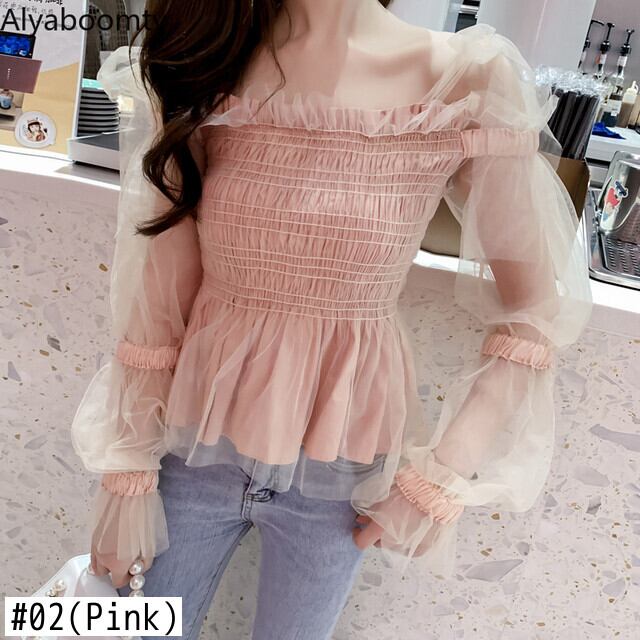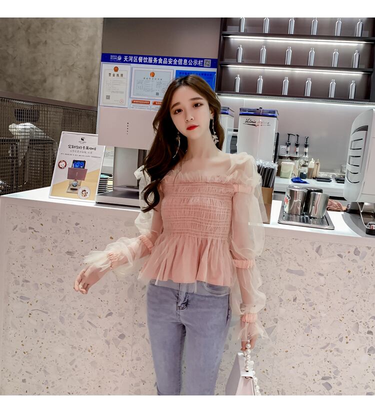 送料無料୨♥୧ スプリングオータムレディースソリッド クロップトップ トップス ホワイトフリルメッシュ長袖スリーブリボンシャツ ロング ピンク ラッフル 春物 秋物 ソリッドカラー AOS32558957139