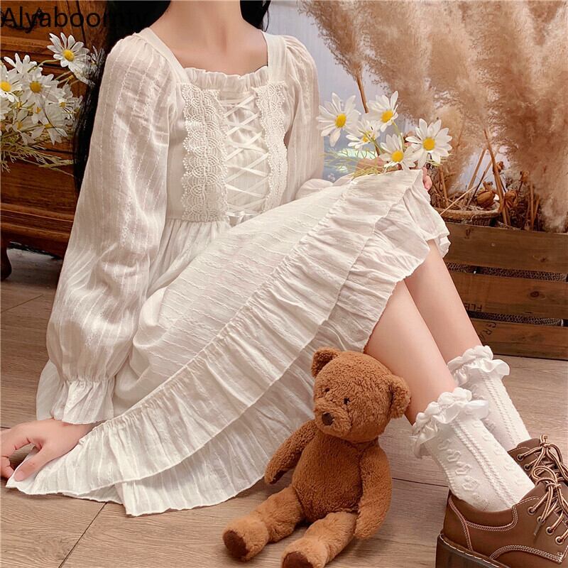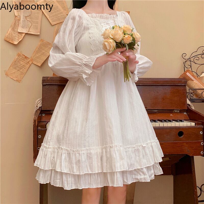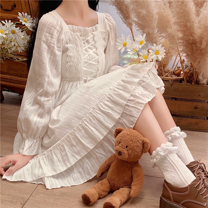 送料無料୨♥୧ スプリングレディースホワイトドレス カラーレースバンドフリル長袖スリーブ ロング レッド ラッフル 春物 スクウェア AOS23057654116
