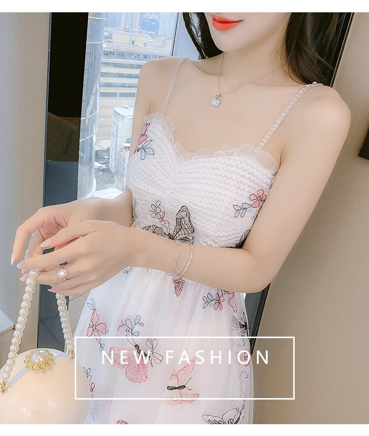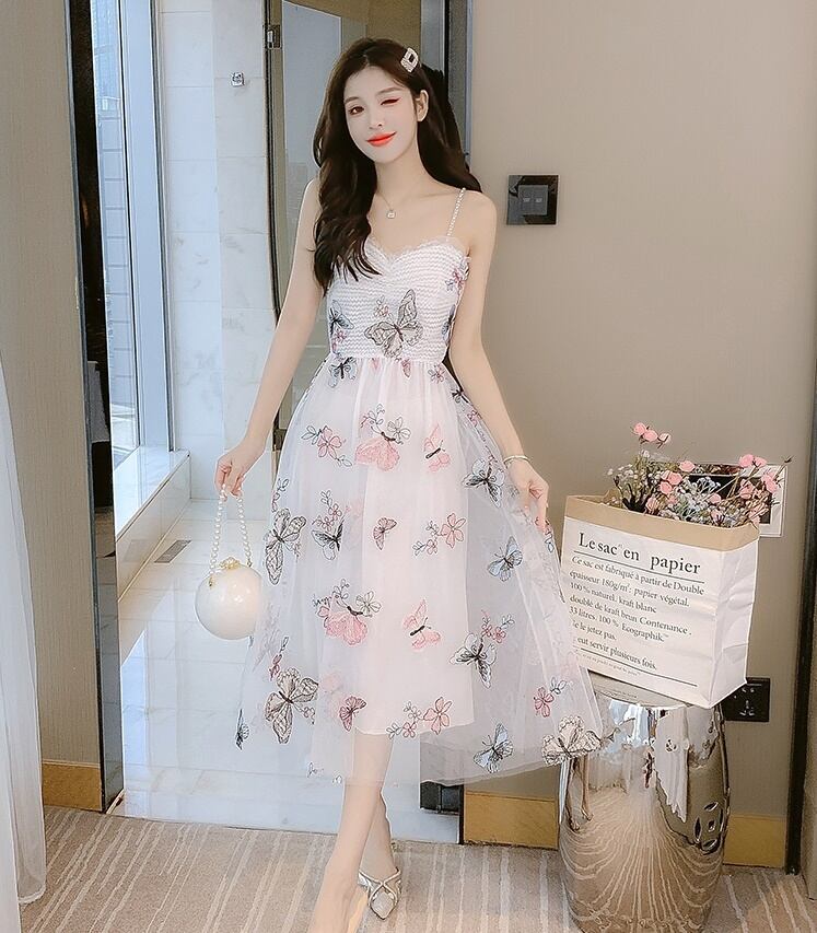 送料無料୨♥୧ サマーレディースミディドレス 刺繍Butterflyデザイン メッシュホワイトノースリーブ ピンク 夏物 AOS5724097750