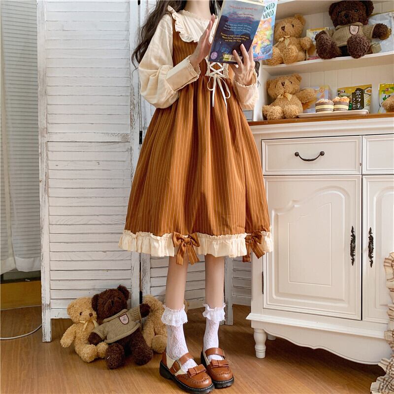 送料無料୨♥୧ スタイルレディースドレス カラーパッチワークストライプバンドリボンフリル ラッフル 大人ガーリー スウィート キュート カジュアル AOS48415541510