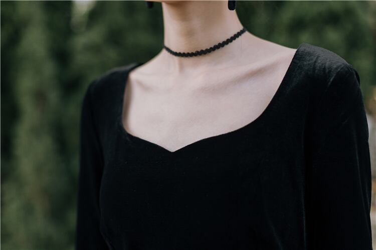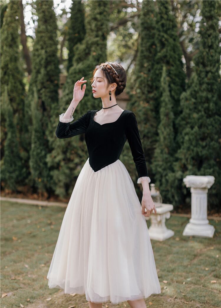 送料無料୨♥୧ スプリングオータムレディースミディドレス ブラックベルベットパッチワークメッシュ七部袖スリーブ 春物 秋物 AOS40191273062