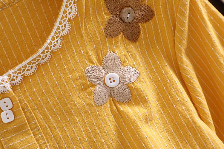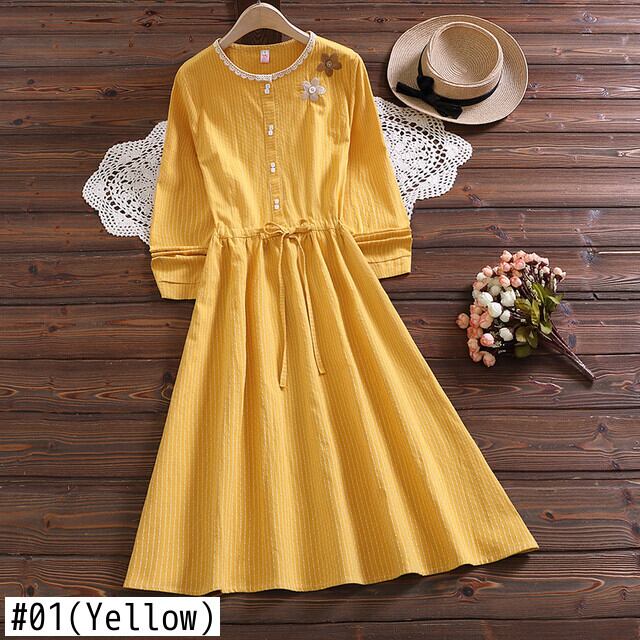 送料無料୨♥୧ レディースイエローAラインドレス ストライプフローラル刺繍レーススプリングオータム 大人ガーリー スウィート キュート カジュアル 春物 秋物 花柄 Oネック レースアップ AOS6402885166