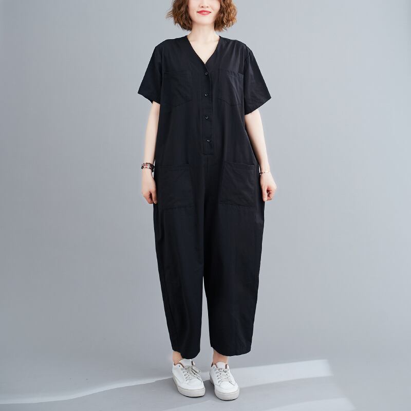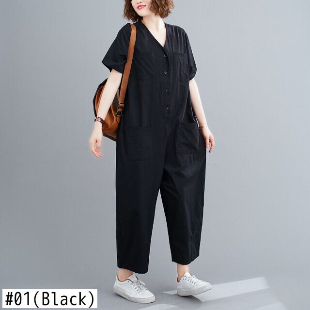 送料無料୨♥୧ サマーレディースソリッド Vネックブラックカーキルーズジャンプスーツ オールインワン オーバーオール ロンパース オールインワン 夏物 ソリッドカラー AOS1683314104