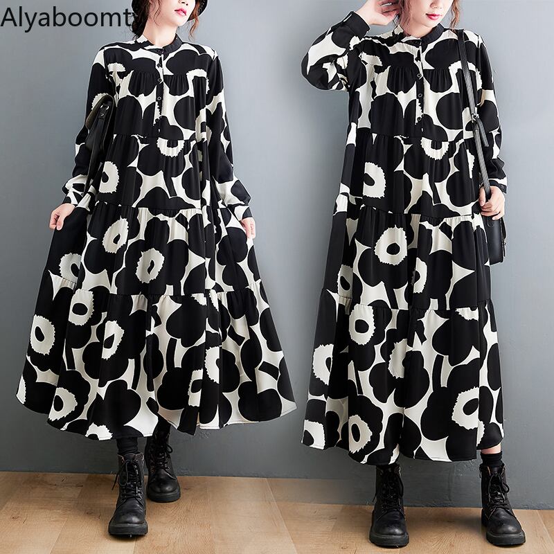 送料無料୨♥୧ スプリングオータムレディースヴィンテージドレス スタンドカラーカラープリントスタンダード長袖スリーブバギーシャツ ロング レトロ 春物 秋物 ビンテージ AOS28853268956
