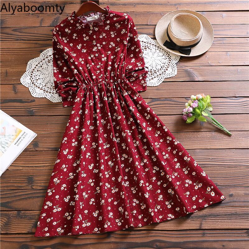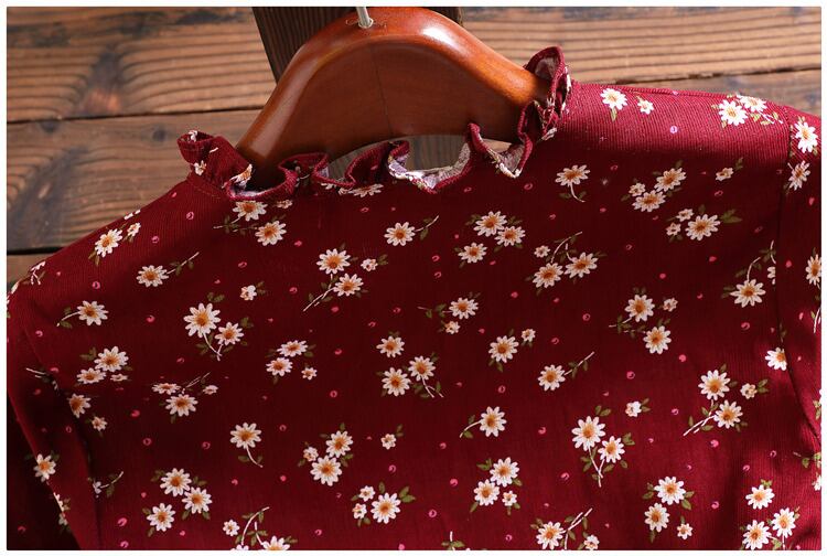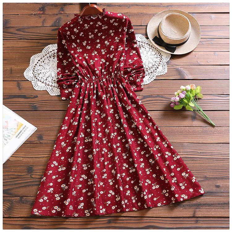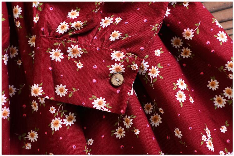 送料無料୨♥୧ スプリングオータムレディースミディドレス カラーレッドフローラルコーデュロイ長袖スリーブ ロング 大人ガーリー スウィート キュート カジュアル 春物 秋物 花柄 AOS92415406201