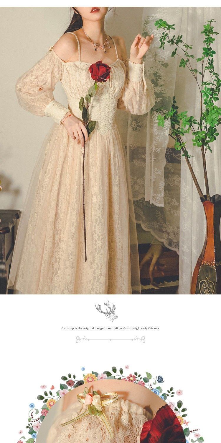 送料無料୨♥୧ スプリングオータムレディースミディドレス 刺繍レースオフショルダーロング 春物 秋物 AOS51288708404