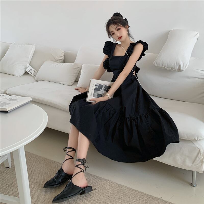 送料無料୨♥୧ サマーレディースブラックミディドレス カラーバックレスリボンフリル ラッフル 大人ガーリー スウィート キュート カジュアル 夏物 スクウェア AOS11776011087