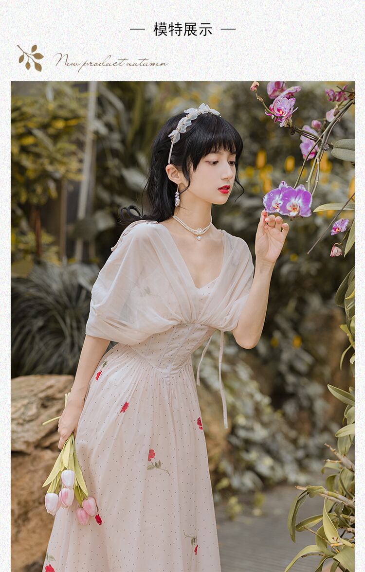 送料無料୨♥୧ サマーレディースロングドレス Vネックフローラルプリントメッシュスリーブ 夏物 花柄 AOS18167948735