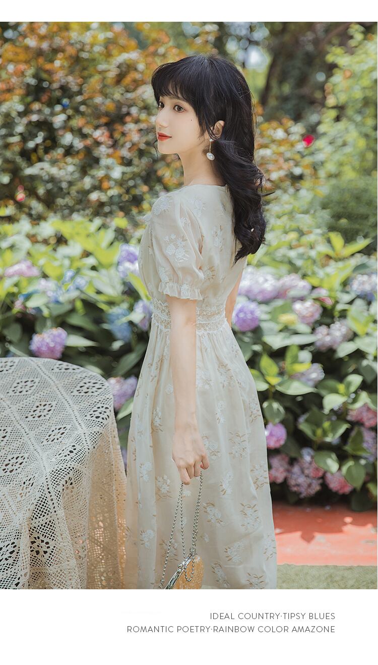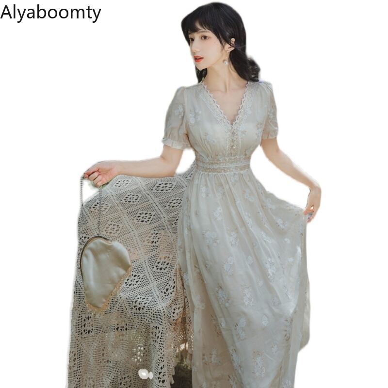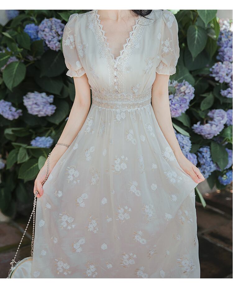 送料無料୨♥୧ サマーレディースロングAラインドレス Vネックフローラルスリーブ刺繍ミディ 大人ガーリー スウィート キュート カジュアル 夏物 花柄 AOS23760358317