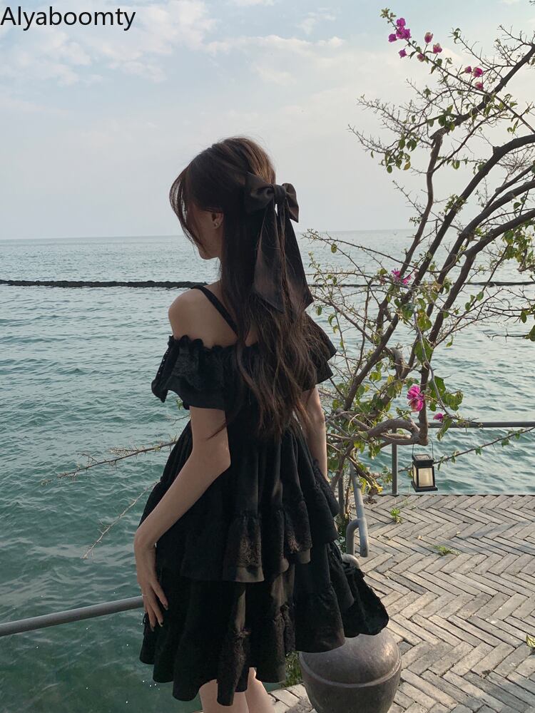 送料無料୨♥୧ サマーレディースブラックドレス オフショルダーレースフリルスリム レッド ラッフル かわいい 夏物 AOS64552243099
